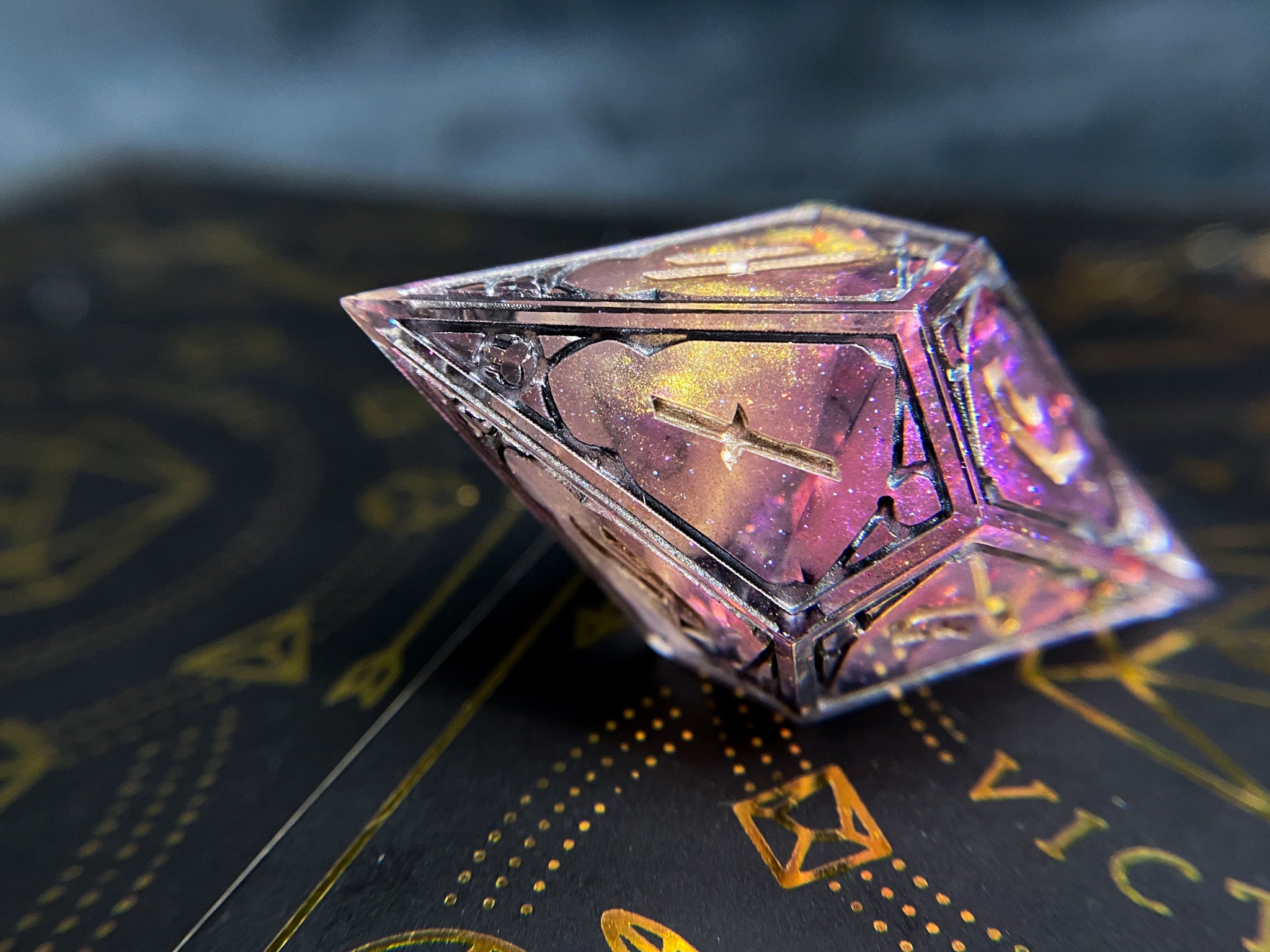 Single oversized d10 with a novelty Infernal font, shimmering rose gold and pink with wisps of black ink and flakes of pink foil. Frames inked in dark silver and numbers in champagne.