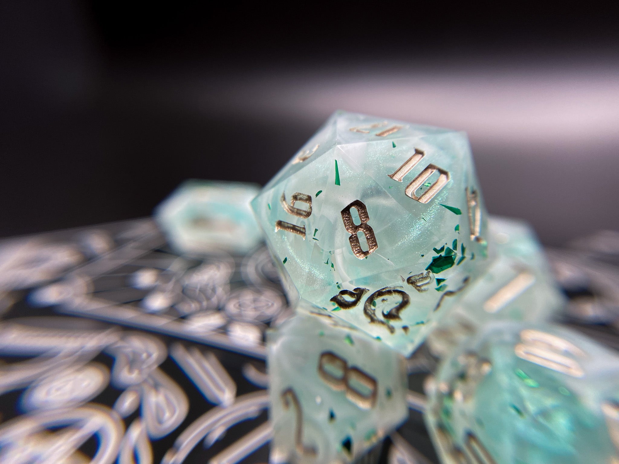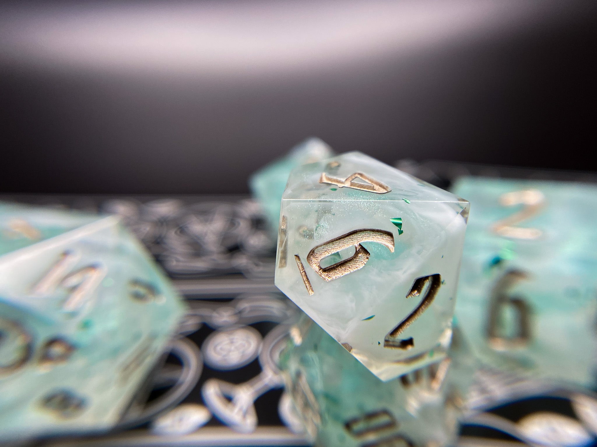 Set of 7 handmade dice, soft shimmering seafoam green and white with flakes of pale green foil. Inked in champagne.