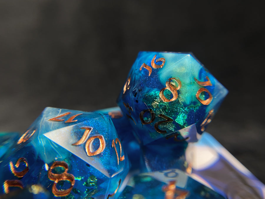 Our dice are made by two people, who between them have the completely normal total of four hands. Those four hands do every step of the process from making molds to not plucking the cat hairs off our finished products. Our dice are not flawless, and may have small mold or sanding marks. They will however be filled with an absurd amount of our creativity and love.