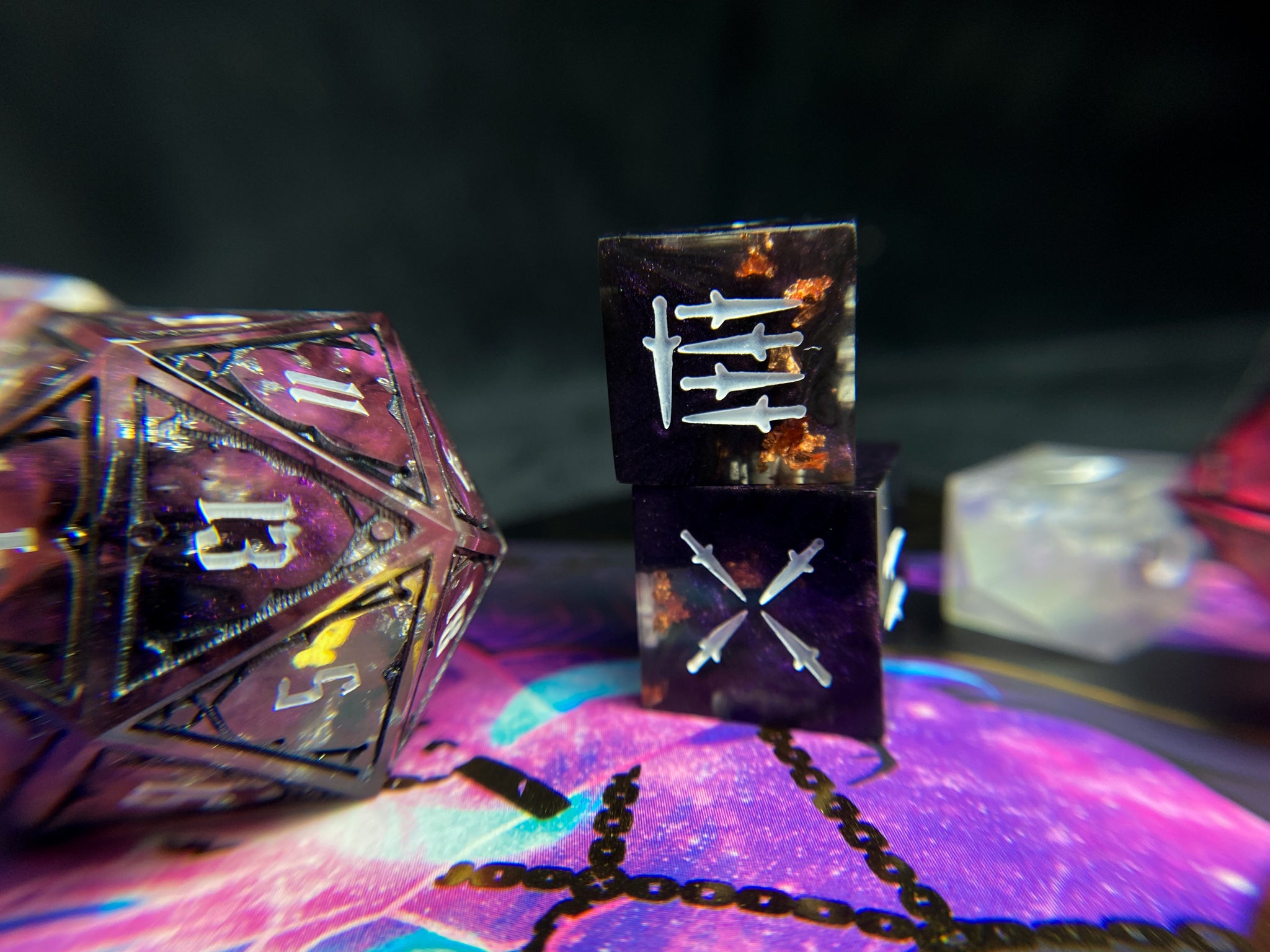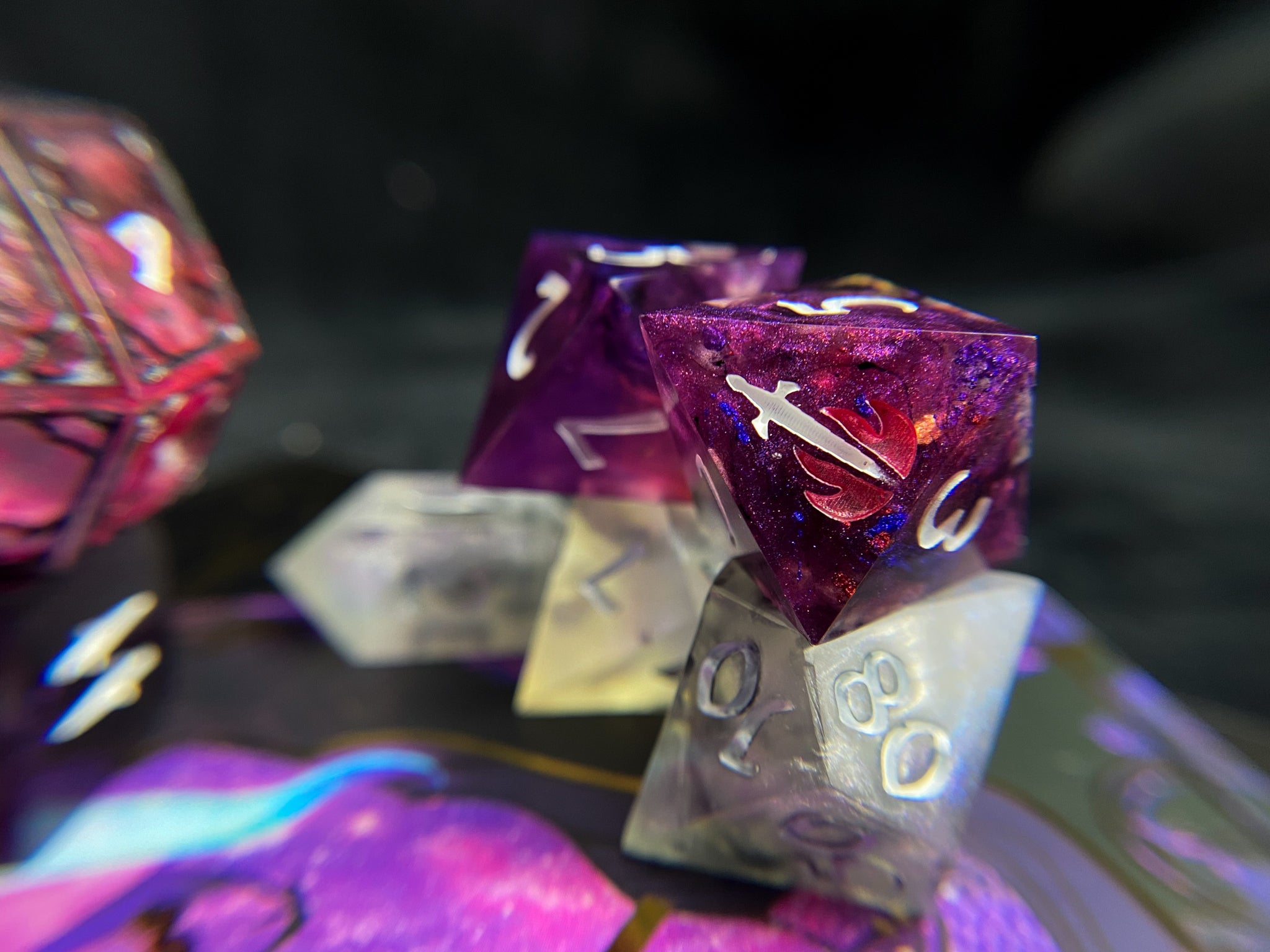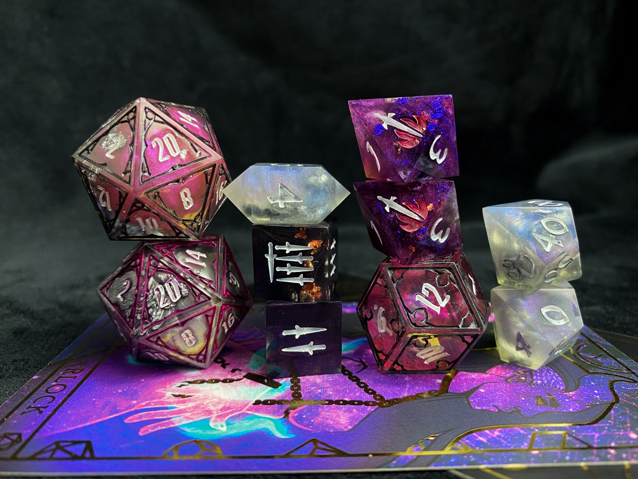 Our dice are made by two people, who between them have the completely normal total of four hands. Those four hands do every step of the process from making molds to not plucking the cat hairs off our finished products. Our dice are not flawless, and may have small mold or sanding marks. They will however be filled with an absurd amount of our creativity and love.