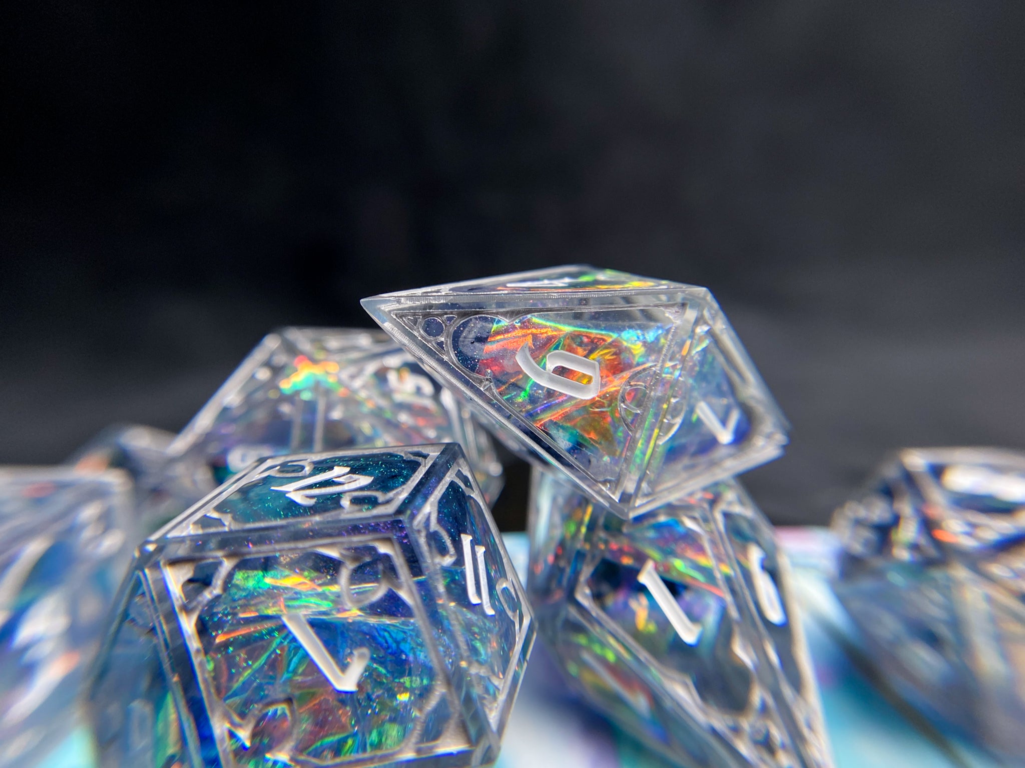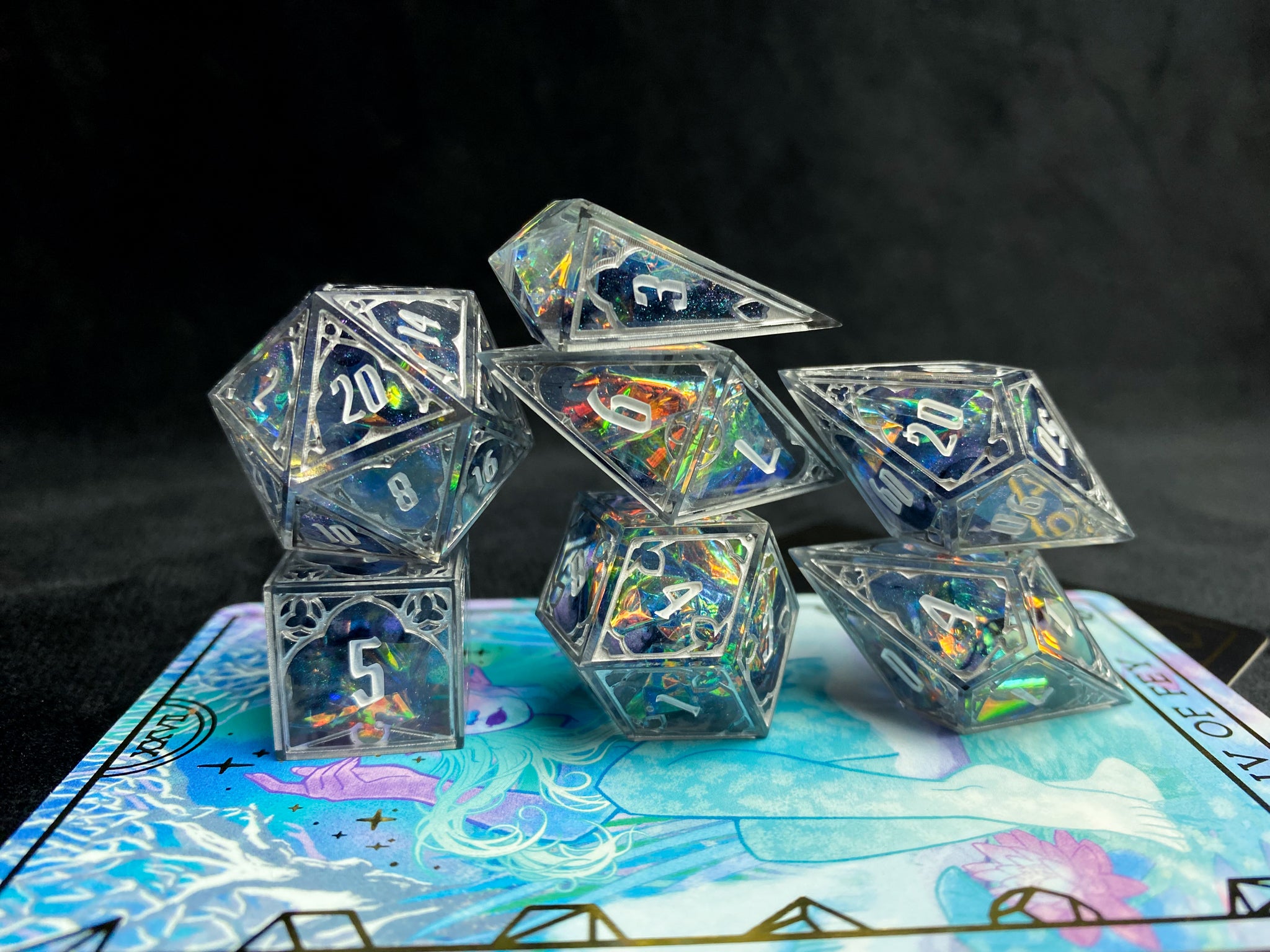 Set of 7 handmade dice, shimmering icy blue with clusters of bright reflective holo film. Numbers inked in white and frames in bright silver.