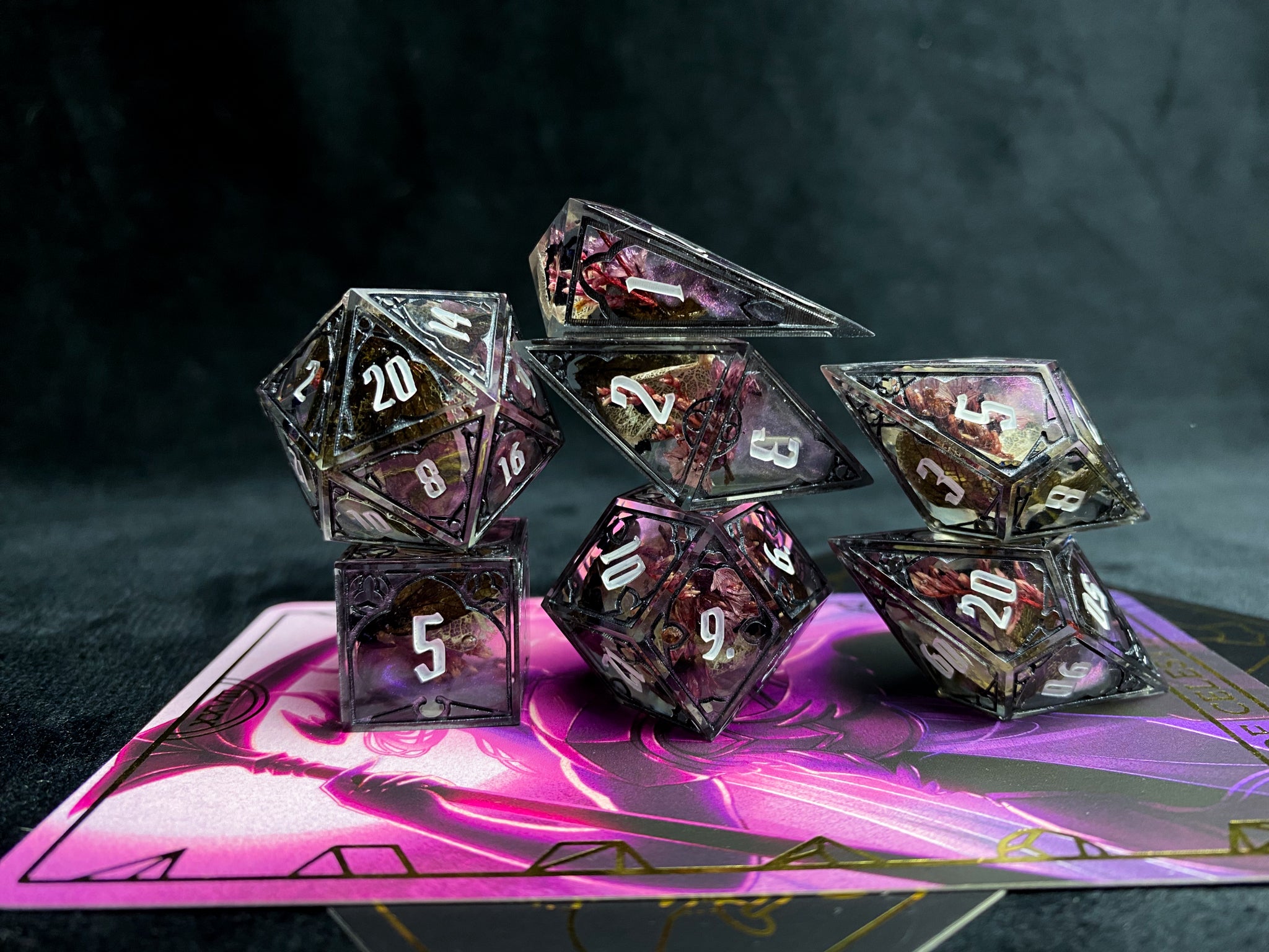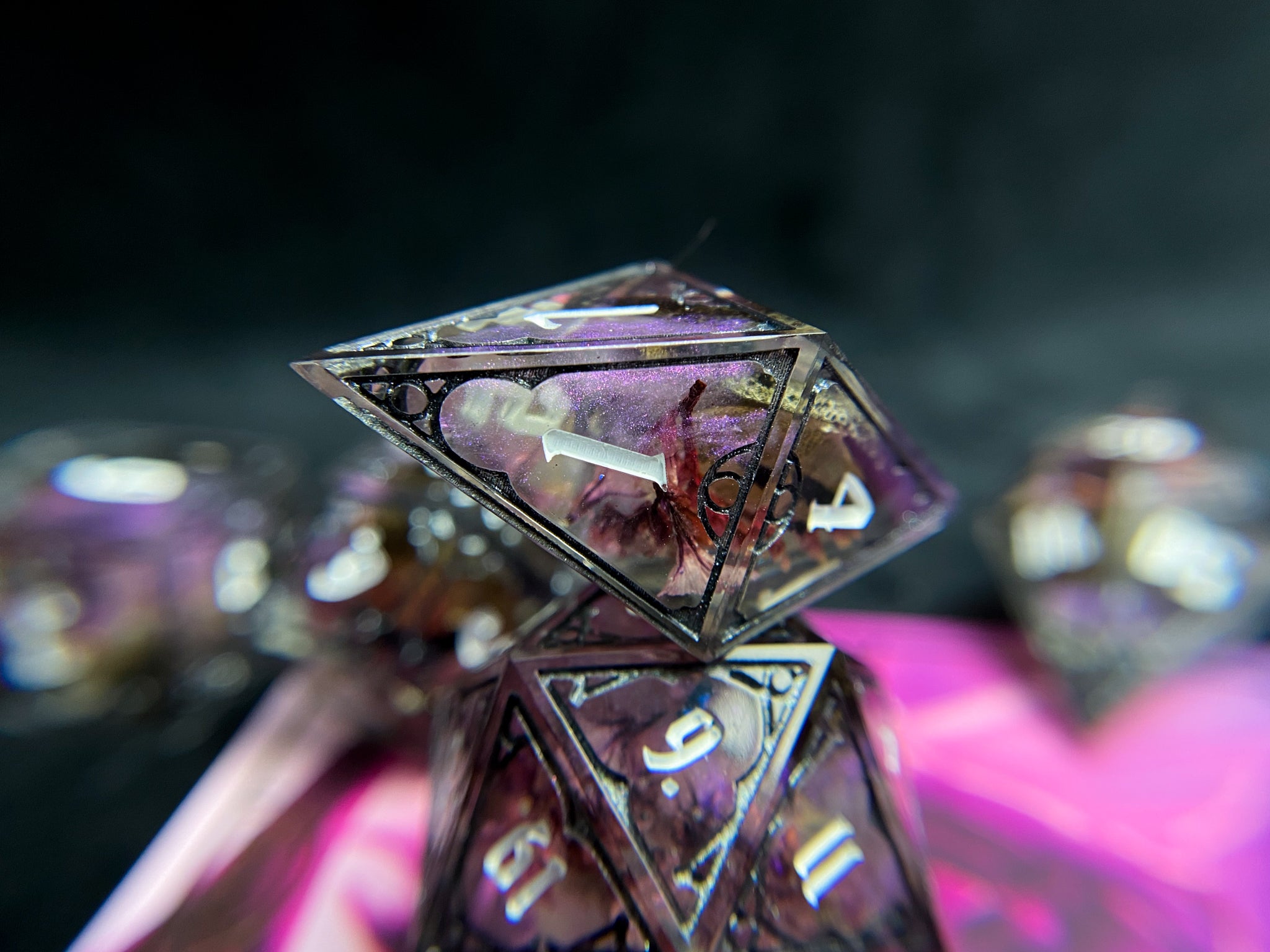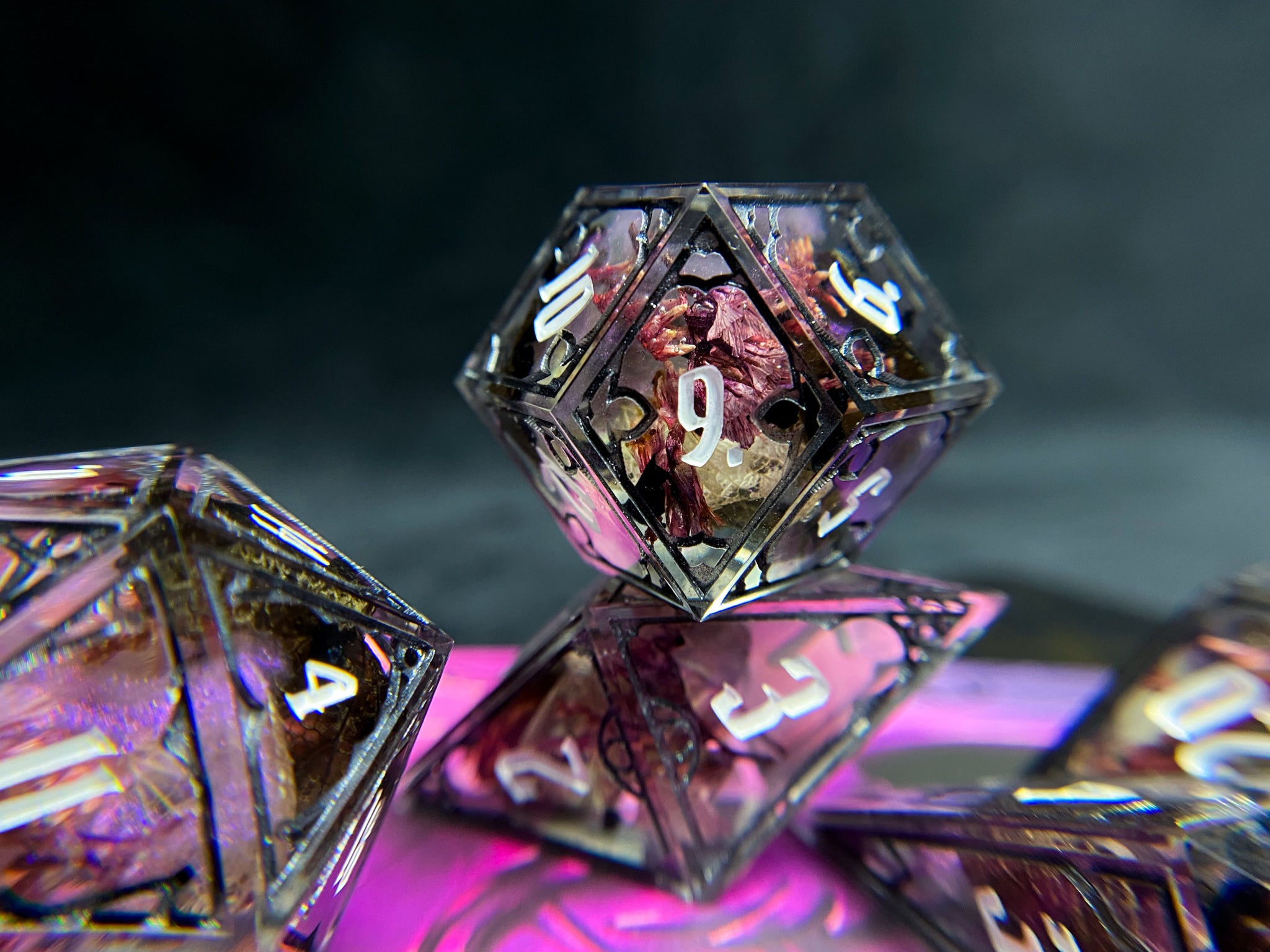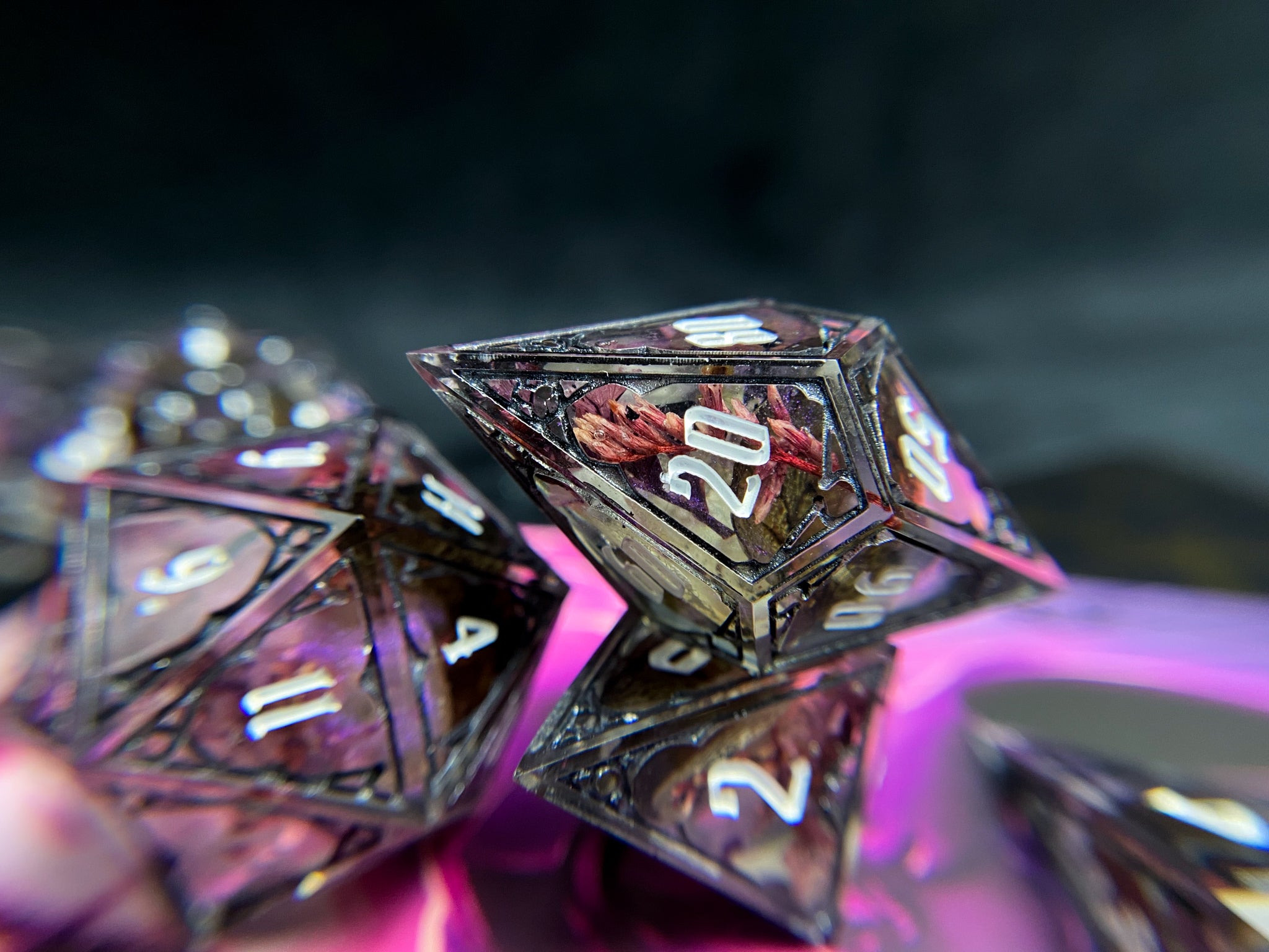 Set of 7 handmade dice, florals in shades of dark pink, black and purple, with skeletal hydrangea petals and flakes of black foil, surrounded by shimmering purple. Frames inked in dark iron and numbers in white.