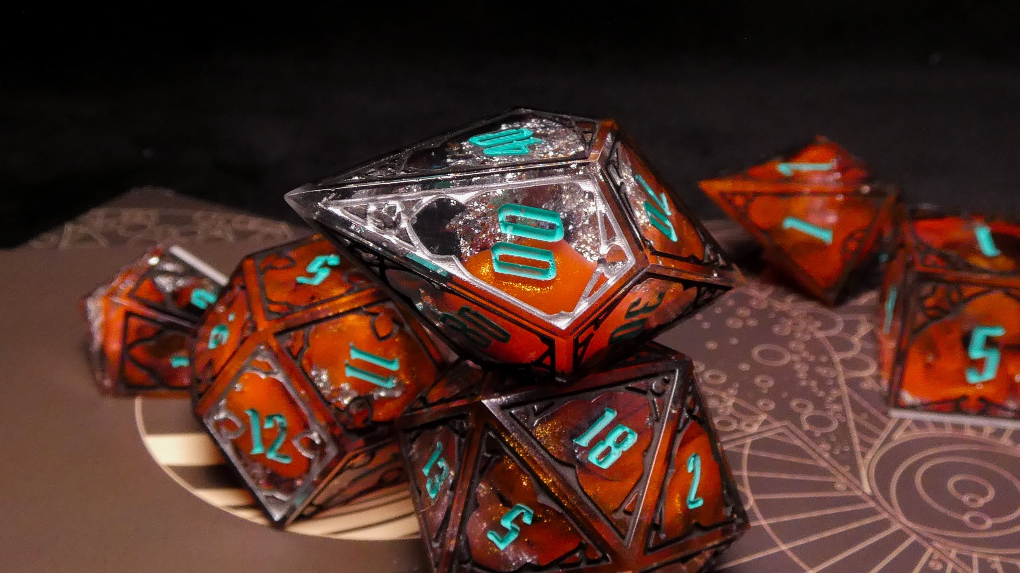 Set of 7 handmade dice, clear resin with flakes of silver, wisps of black, and deep fiery waves of orange. Numbers inked in bright teal and frames in black with silver frames on high faces.
