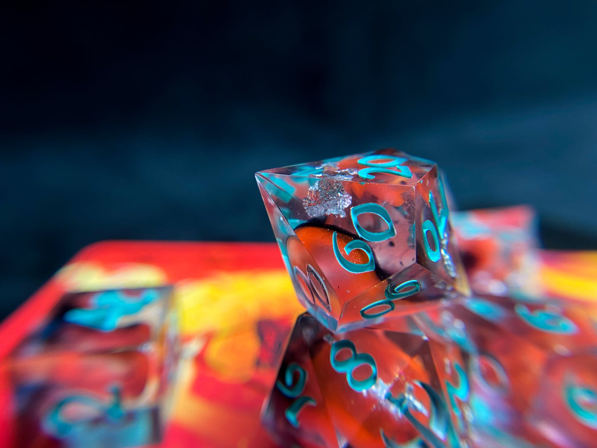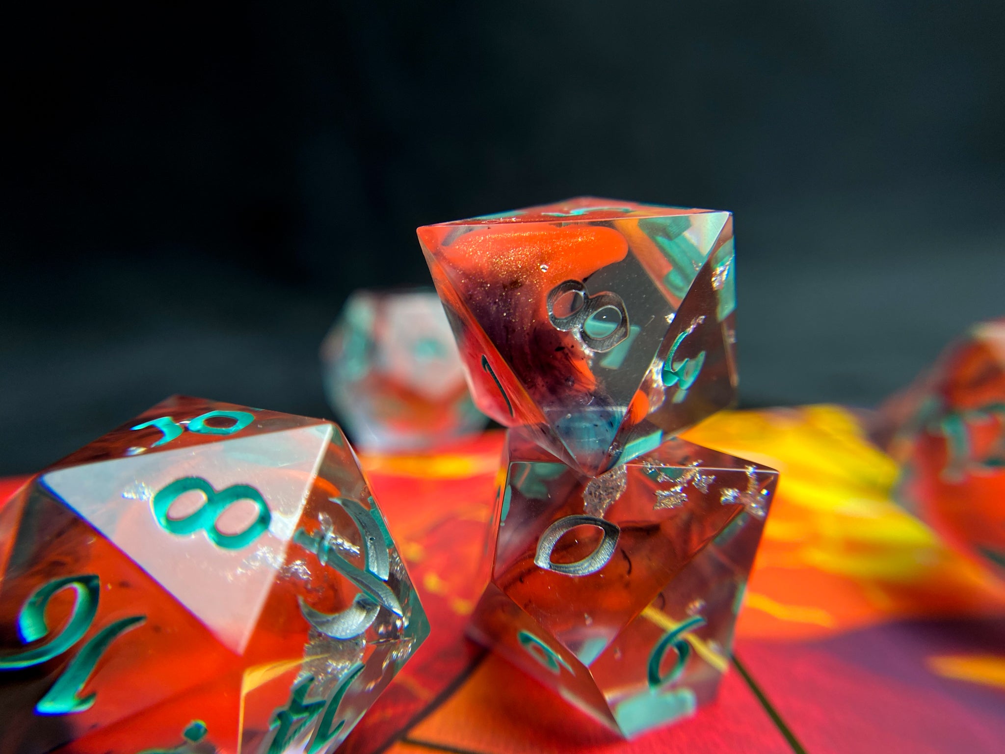 Set of 8 handmade dice, clear resin with flakes of silver, wisps of black, and deep fiery waves of orange. Inked in bright teal with silver high faces.