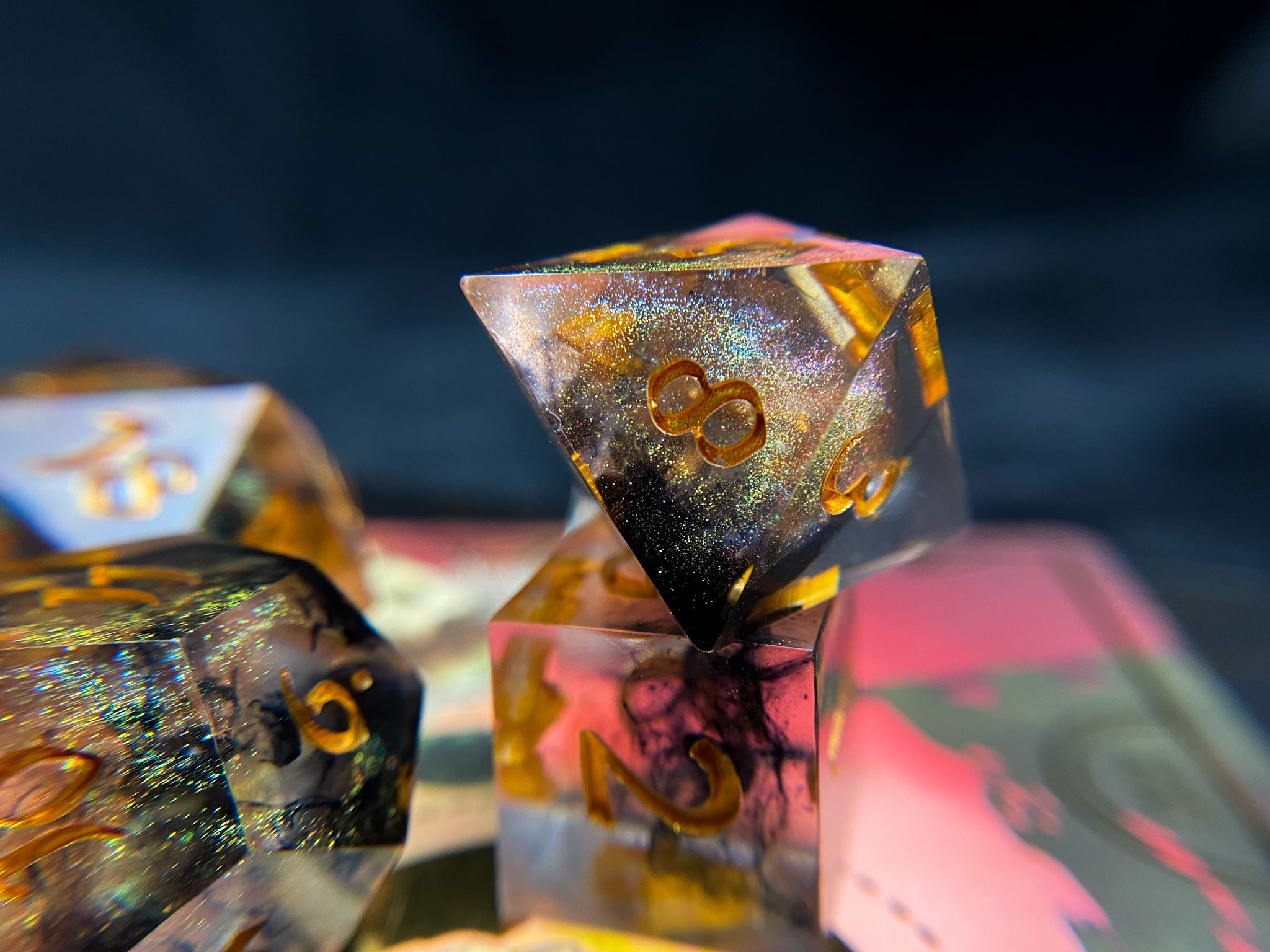 Set of 8 handmade dice, wisps of black ink and multi-colored colorshifting shimmer. Inked in antique gold.