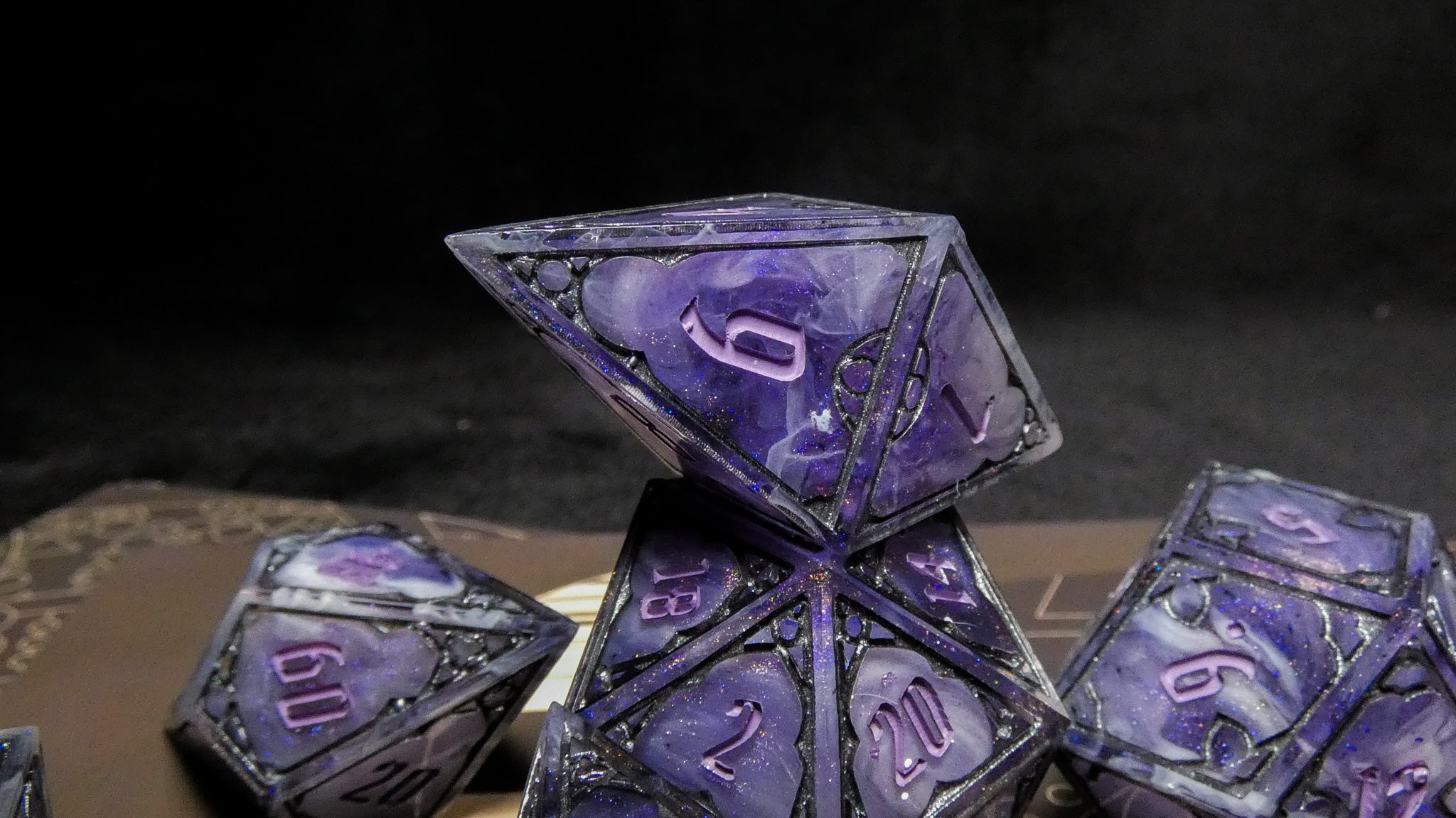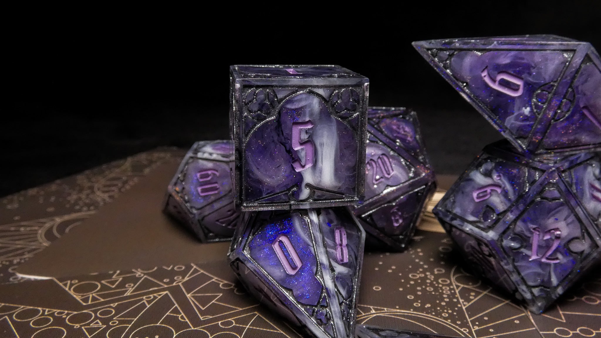 Set of 7 handmade dice, soft tones of shifting purple with waves of black and white. Numbers inked in muted purple and frames in iron gray.