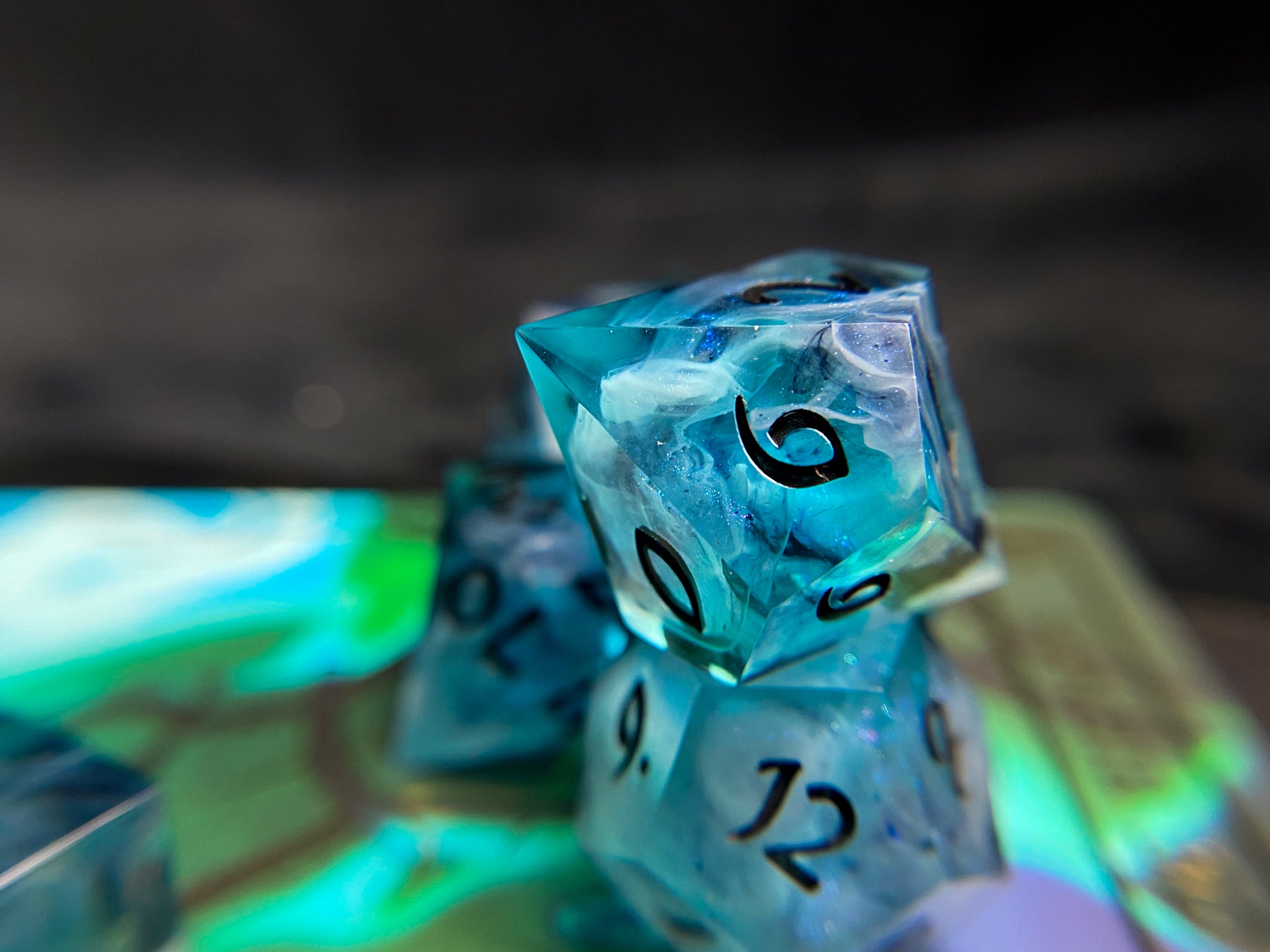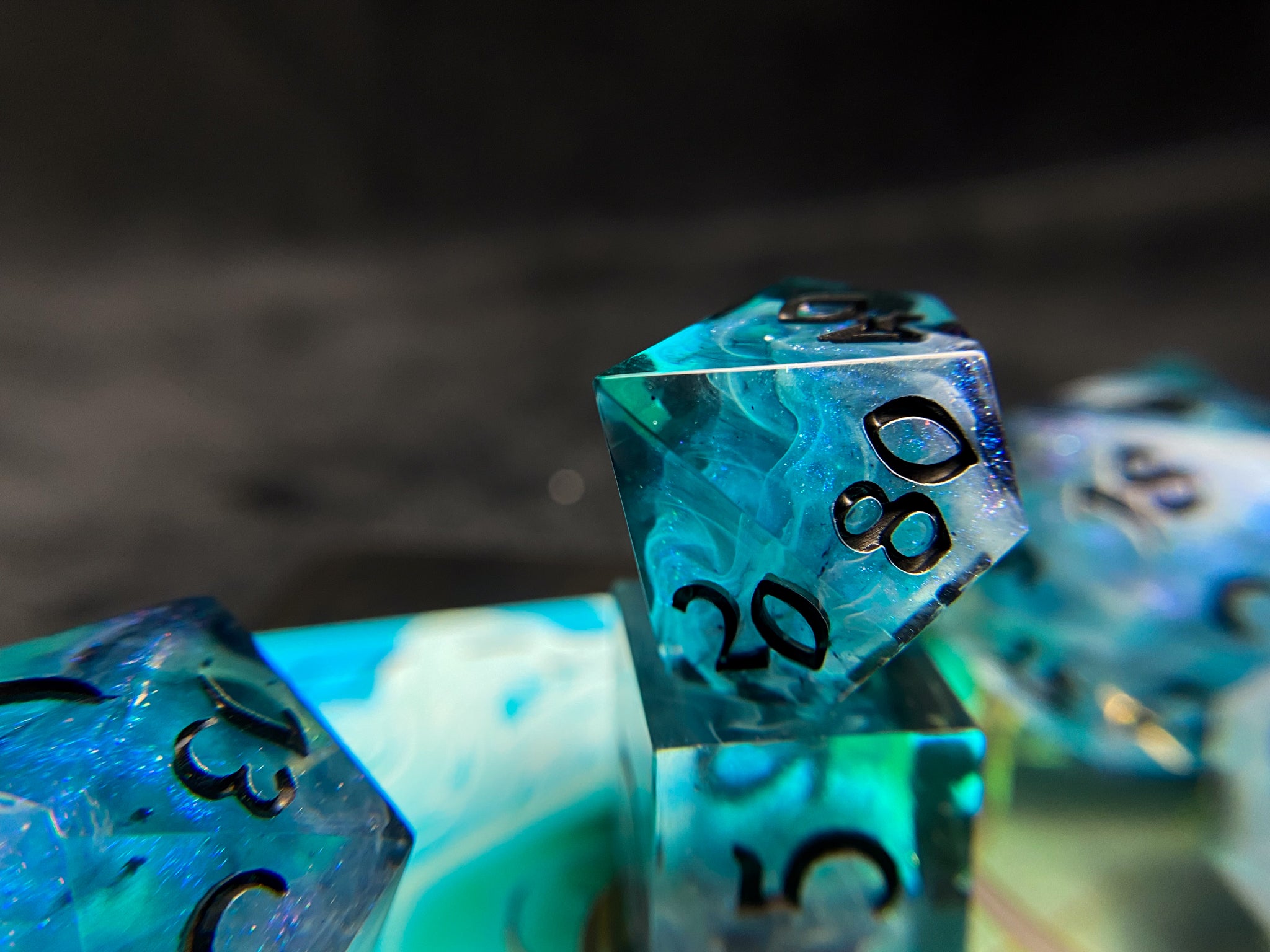 Set of 8 handmade dice, watery waves of blue, white, black and colorshifting blue/green/purple. Inked in black.