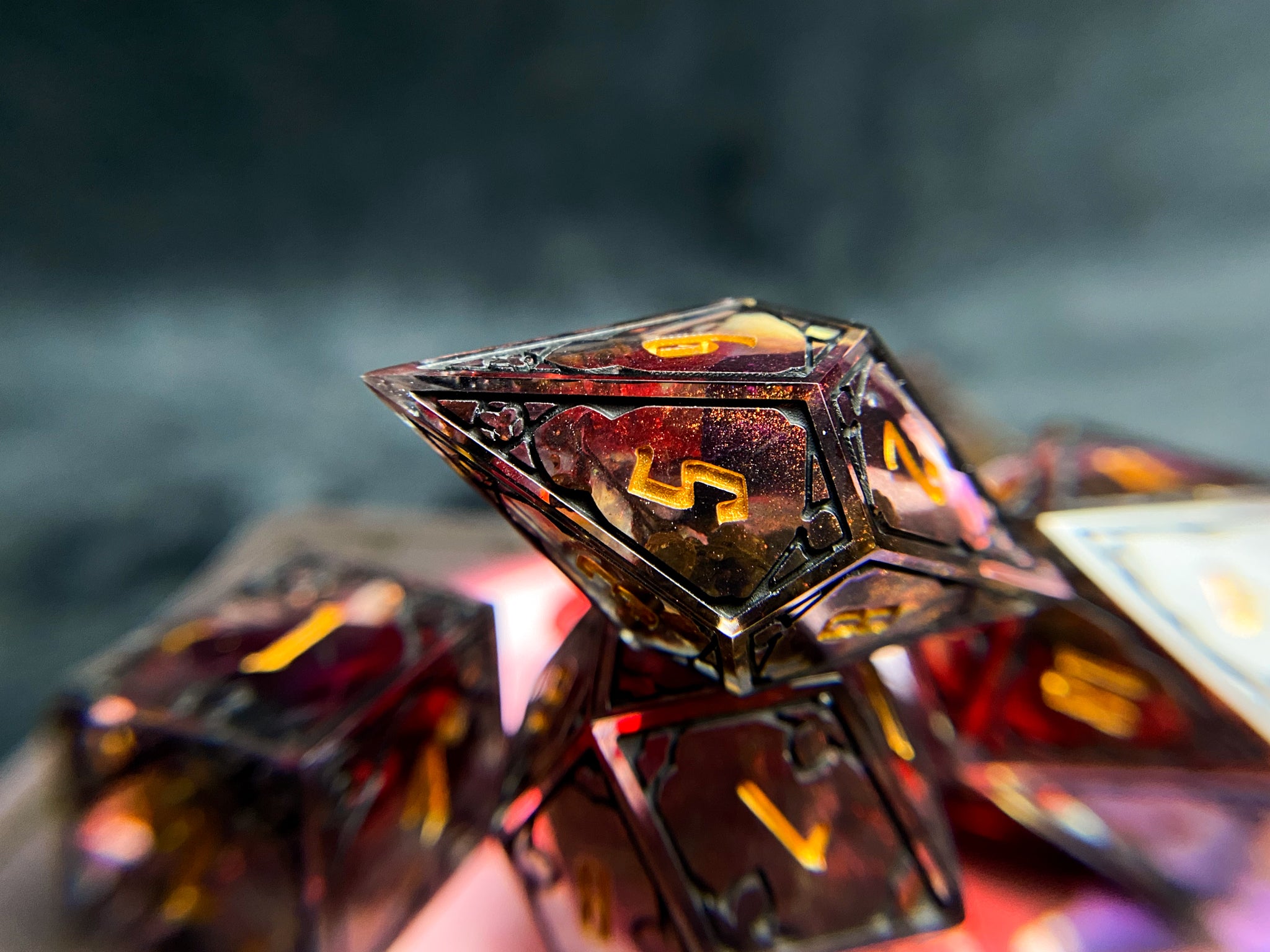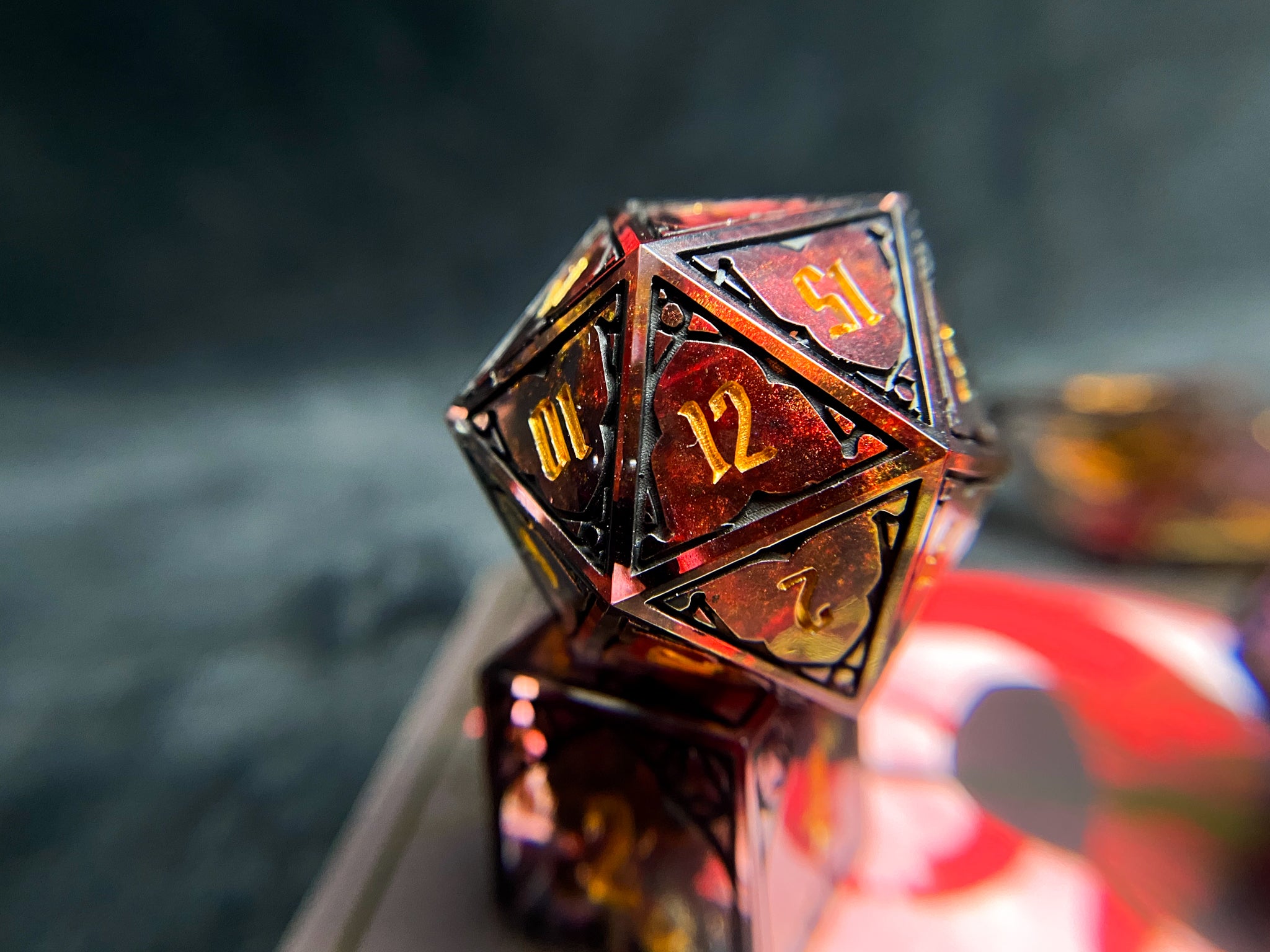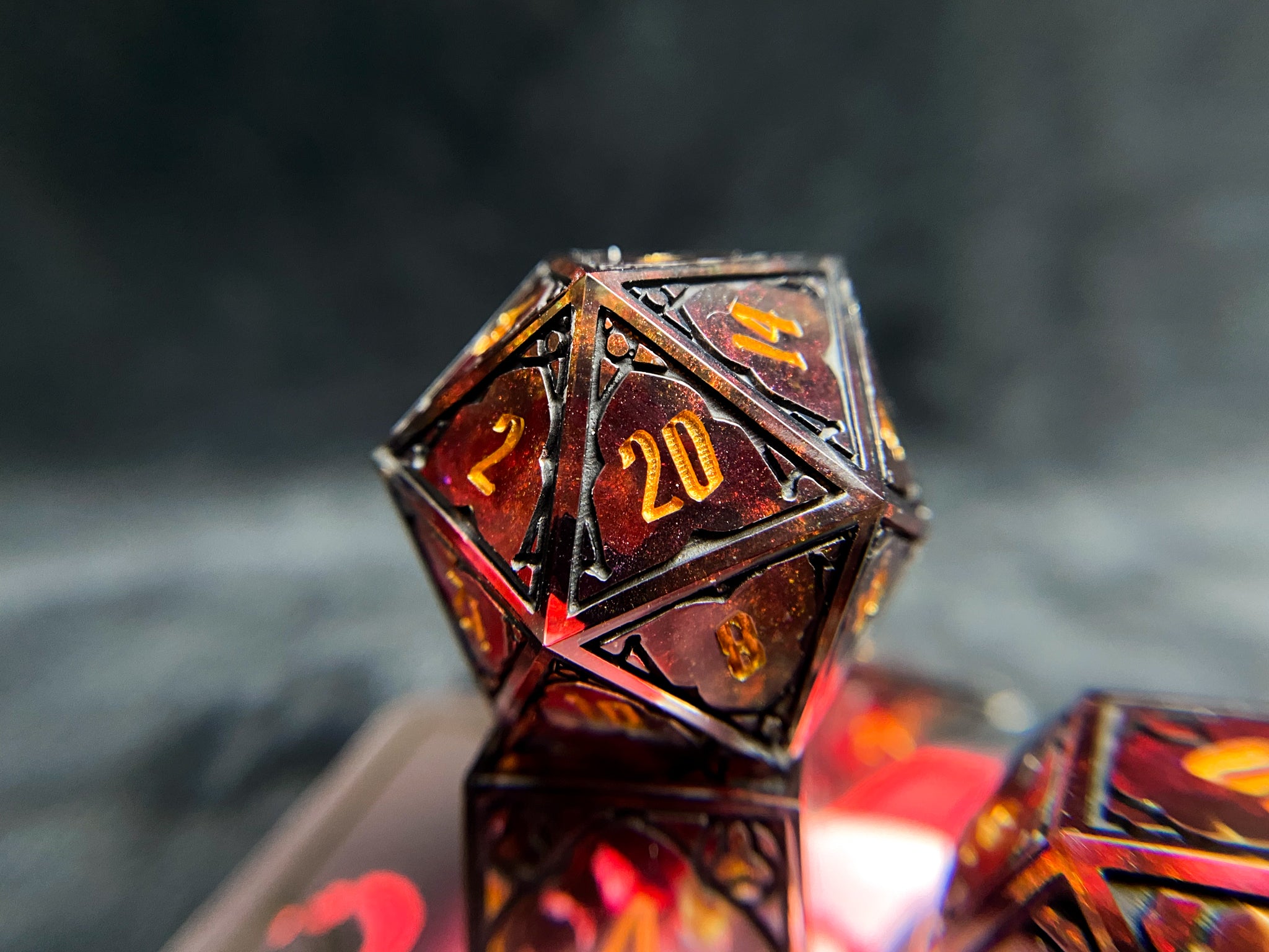 Set of 7 handmade dice, deep tones of blood red and colorshifting red/gold with dark rose petals and black flowers. Numbers inked in gold and frames in matte black.