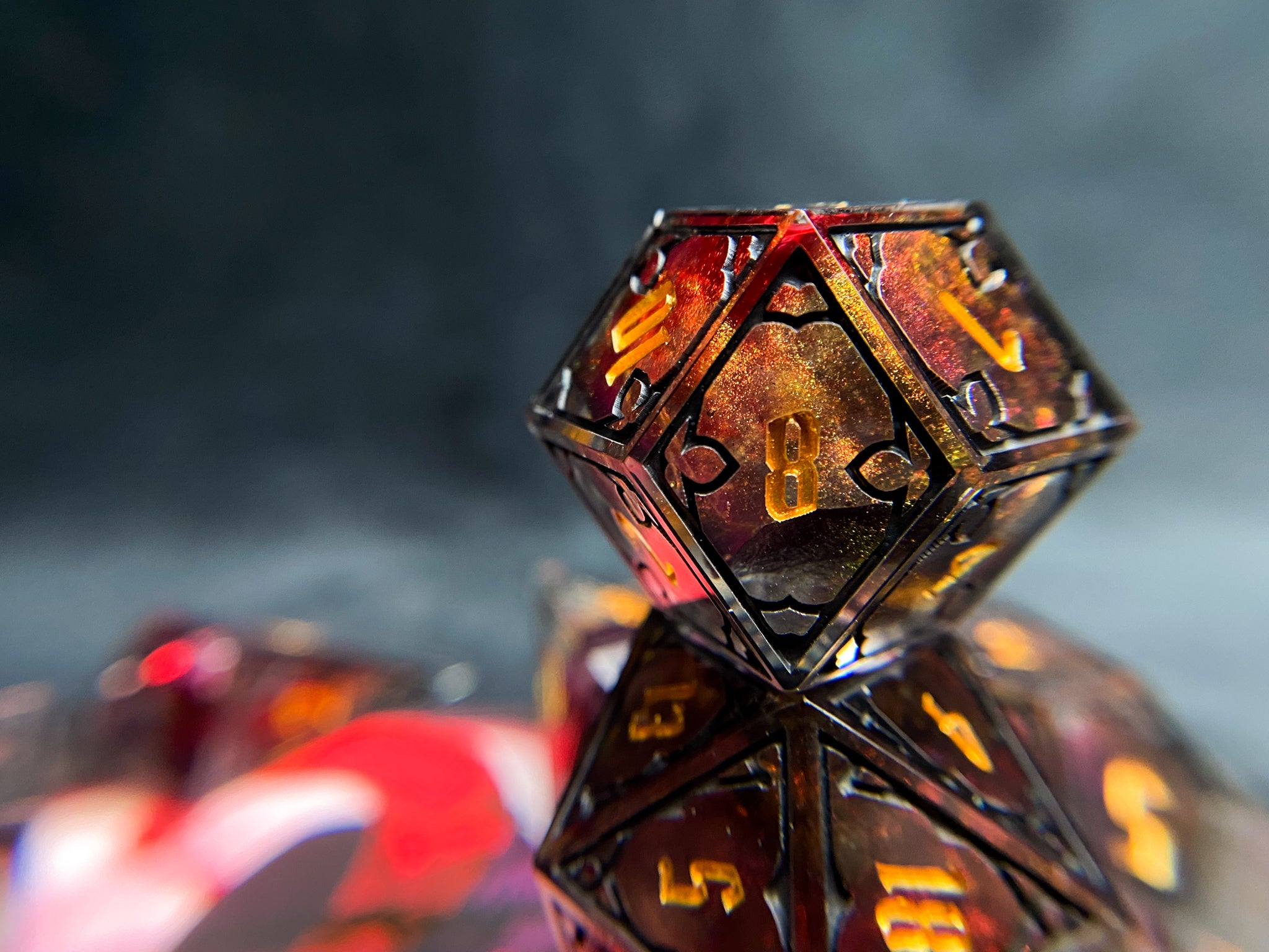 Our dice are made by two people, who between them have the completely normal total of four hands. Those four hands do every step of the process from making molds to not plucking the cat hairs off our finished products. Our dice are not flawless, and may have small mold or sanding marks. They will however be filled with an absurd amount of our creativity and love.