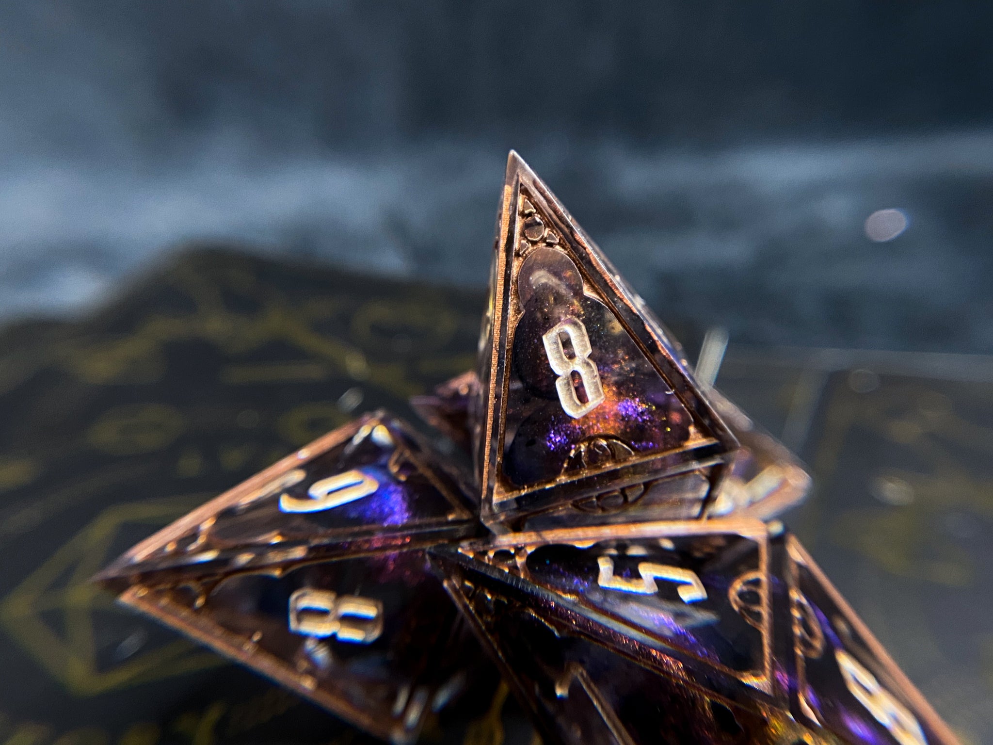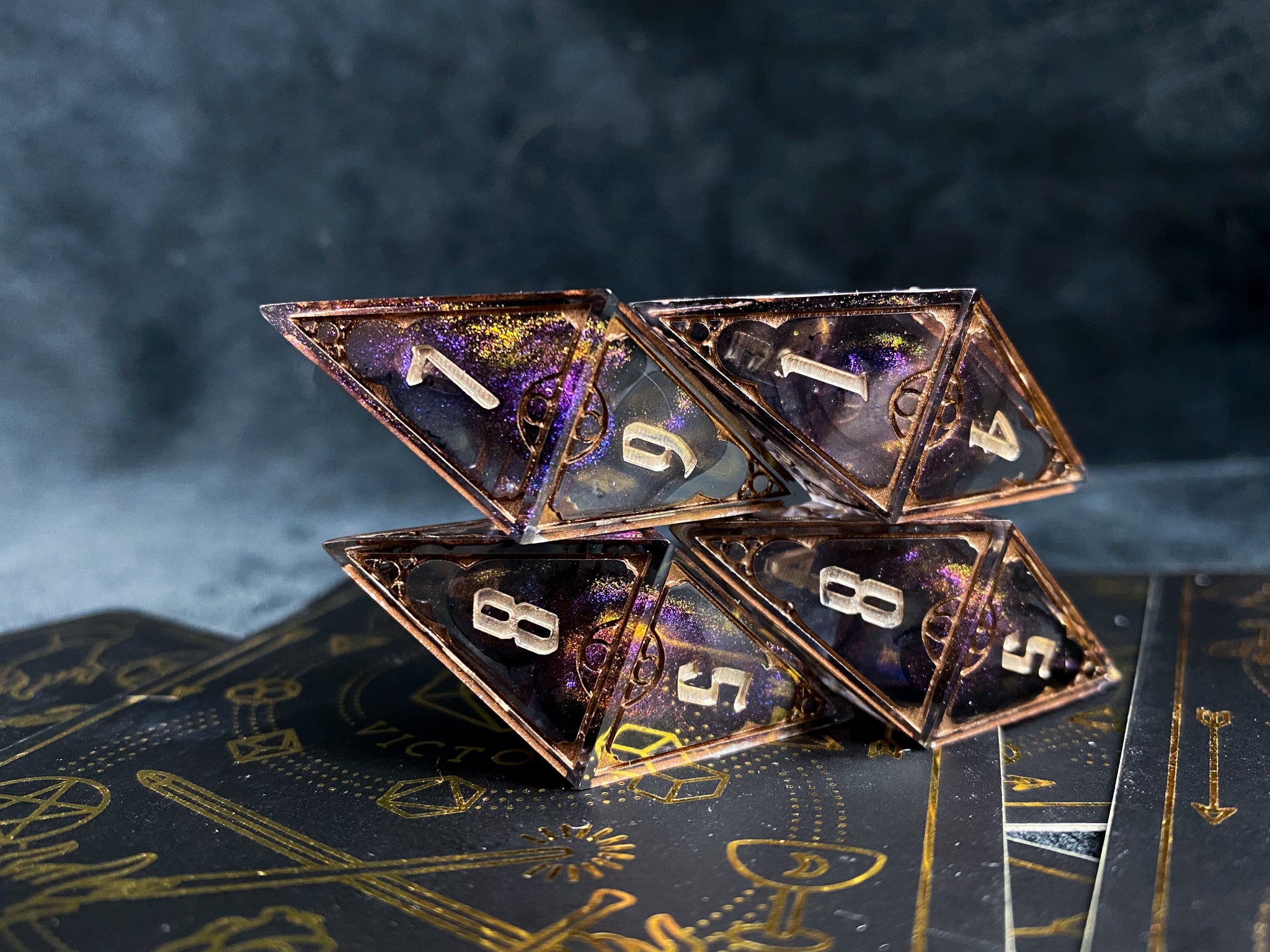 Four oversized d8s, waves of deep purple/bronze colorshift with wisps of black ink. Frames inked in dark bronze and numbers in champagne.