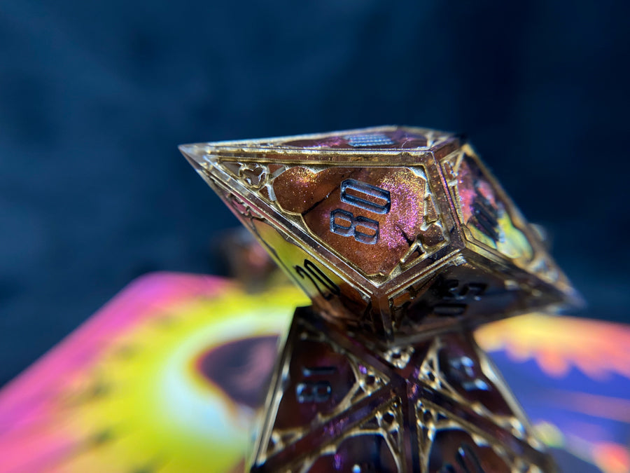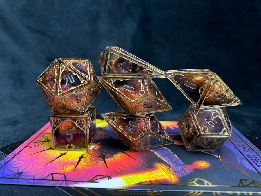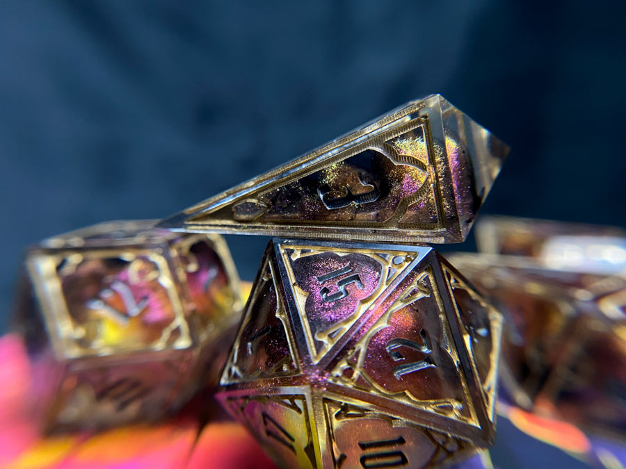 Set of 7 handmade dice, rich fiery colorshift in shades of red/gold/green with wisps of black ink. Frames inked in chrome gold and numbers in gunmetal.