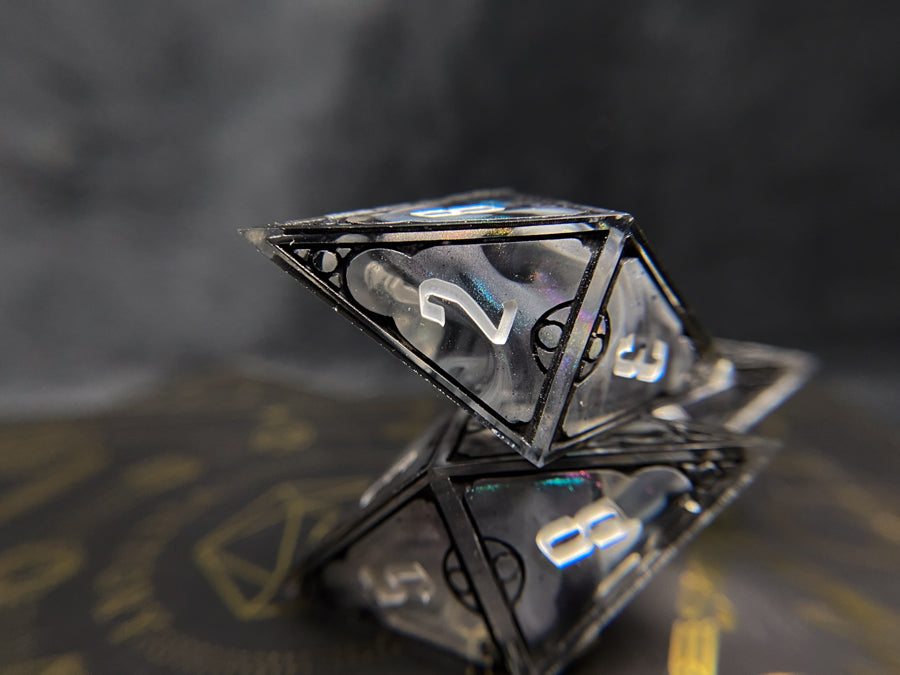 Trio of oversized d8s, clouds of dark colorshifting shimmer and wisps of white. Frames inked in black and numbers in white.