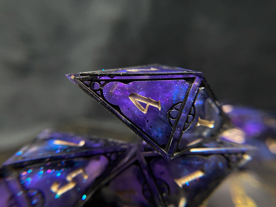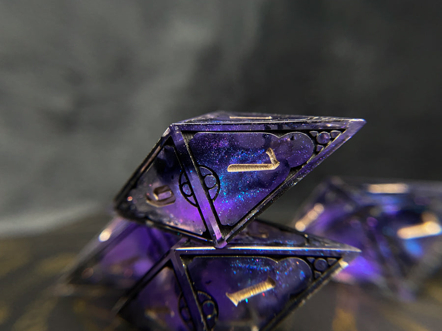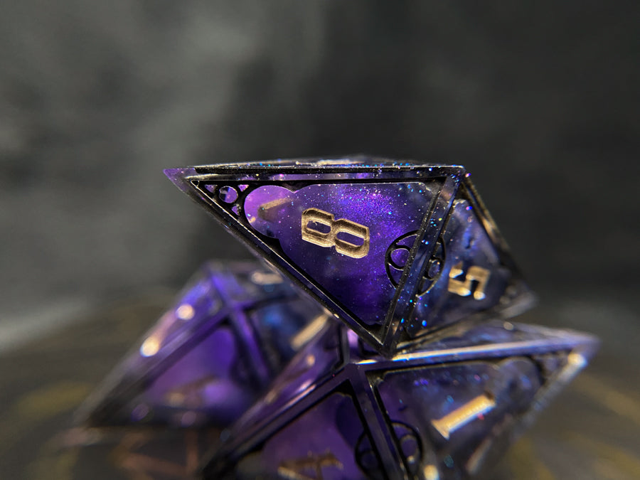 Four oversized d8s, rich shimmering purple/bronze tones with sparkles of color shift and wisps of black ink. Frames inked in black and numbers in champagne.