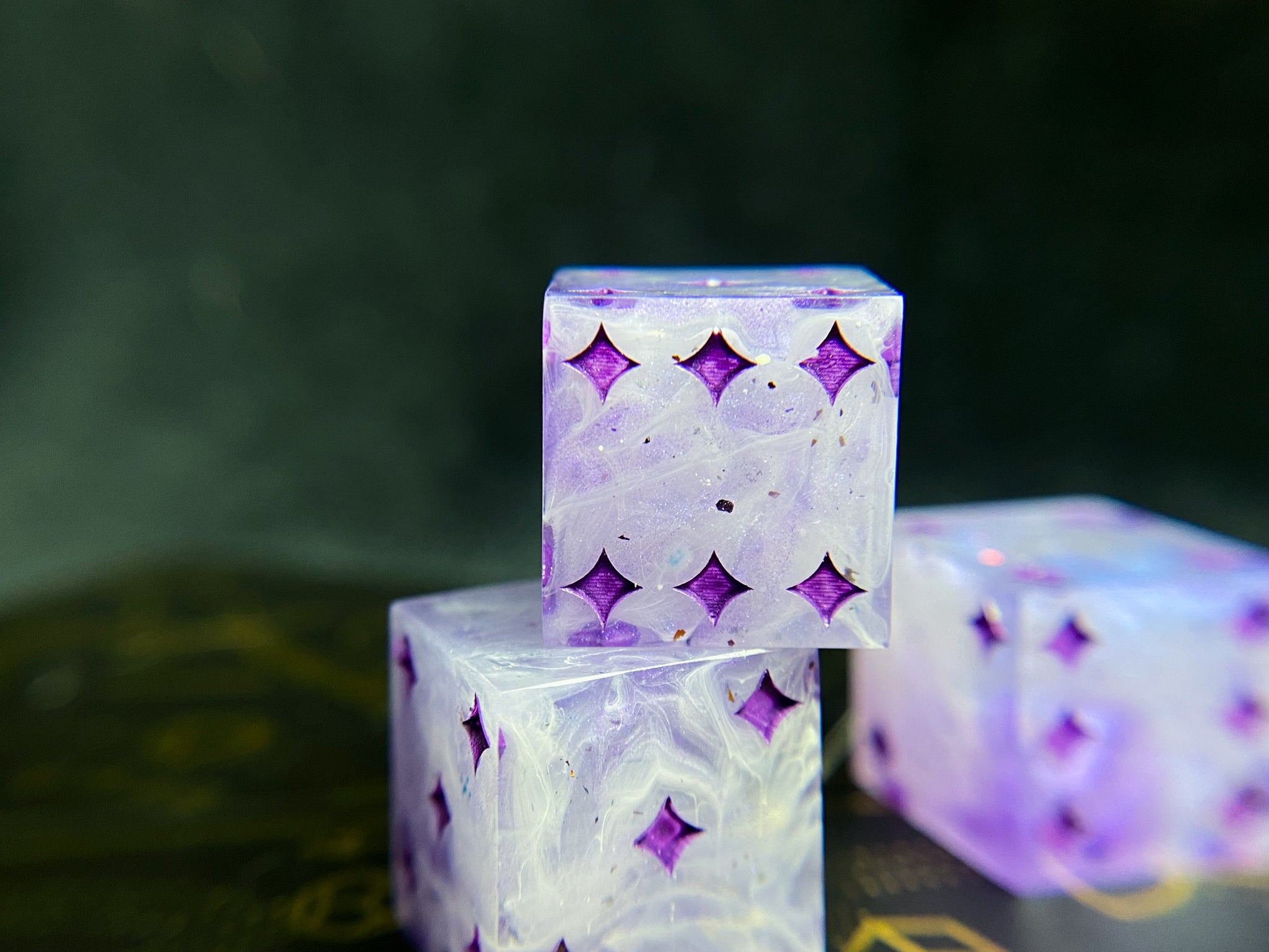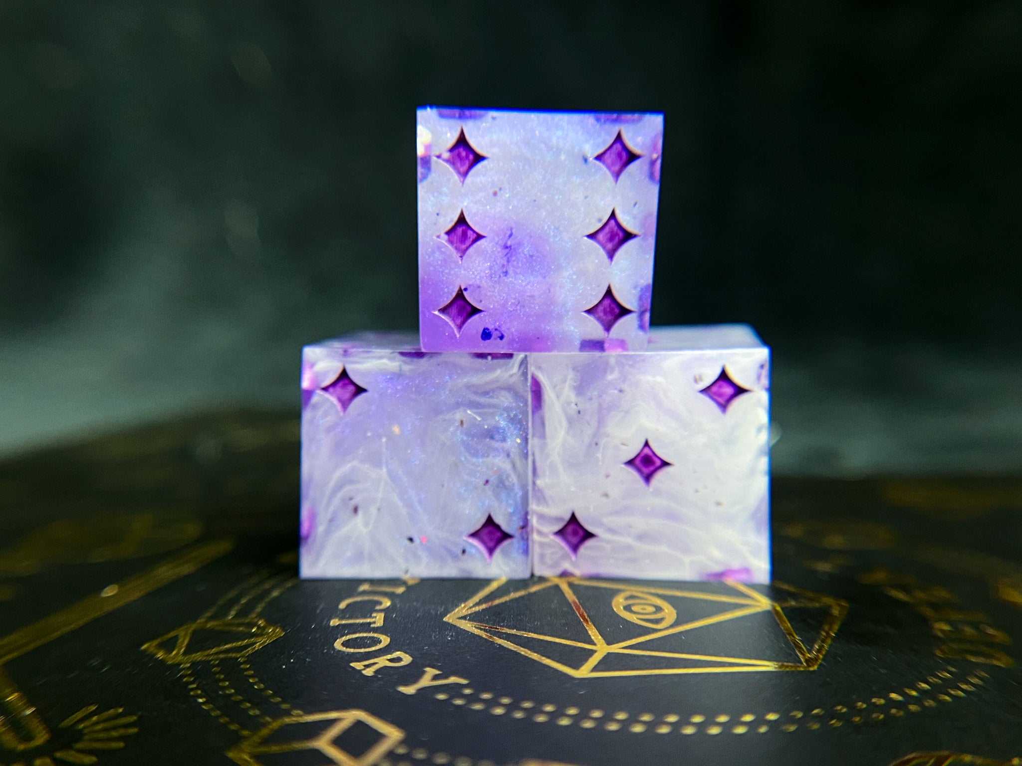 Three star-pip d6s, shimmering purple with subtle blue colorshift and sparkle. Inked in purple.