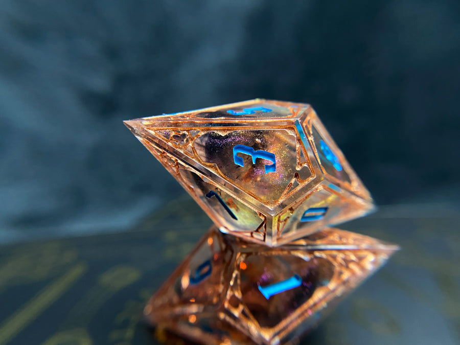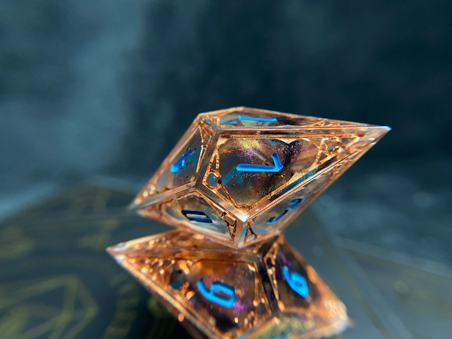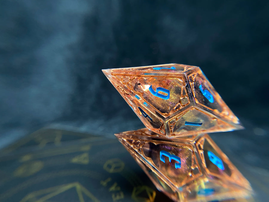 Our dice are made by two people, who between them have the completely normal total of four hands. Those four hands do every step of the process from making molds to not plucking the cat hairs off our finished products. Our dice are not flawless, and may have small mold or sanding marks. They will however be filled with an absurd amount of our creativity and love.