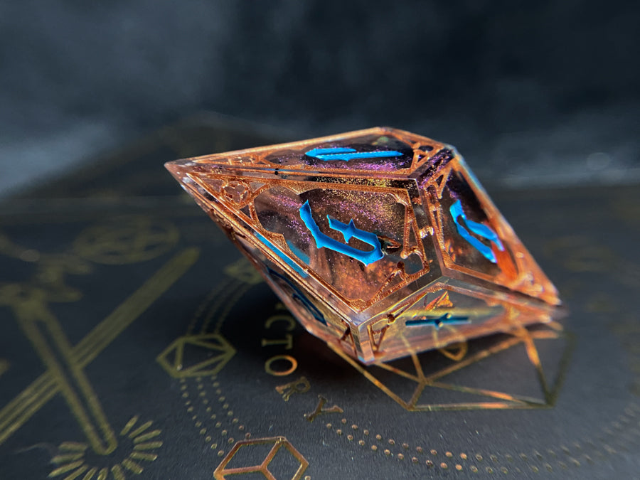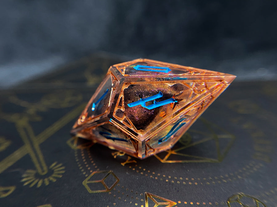 Single oversized d10 with a novelty Infernal font, dusty bronze colorshifting shimmer with flakes of copper foil and wisps of black ink. Frames inked in brass and numbers in teal.