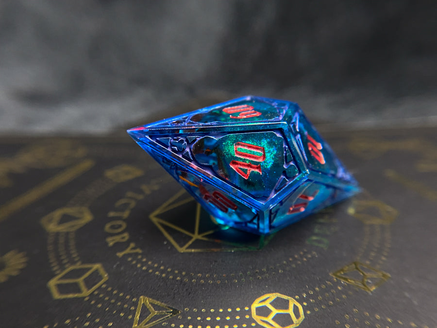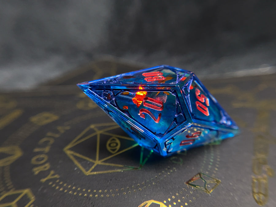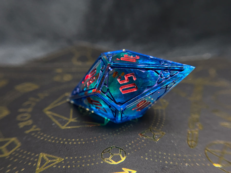 Single oversized d10, waves of blue with a shimmer of gold and flakes of red foil. Frames inked in dark blue and numbers in metallic red.