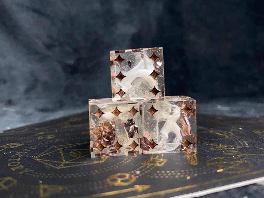 Three star-pip d6s, clear resin with subtle pink/blue shimmer, wisps of white, and flakes of champagne colored foil. Inked in dark bronze.