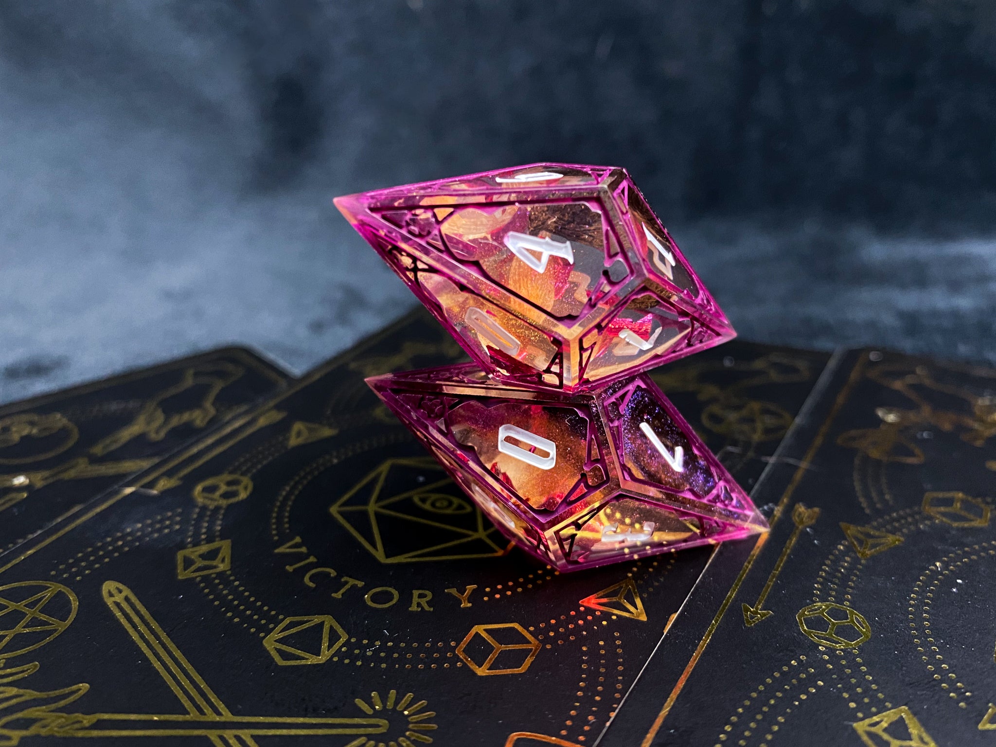 Our dice are made by two people, who between them have the completely normal total of four hands. Those four hands do every step of the process from making molds to not plucking the cat hairs off our finished products. Our dice are not flawless, and may have small mold or sanding marks. They will however be filled with an absurd amount of our creativity and love.