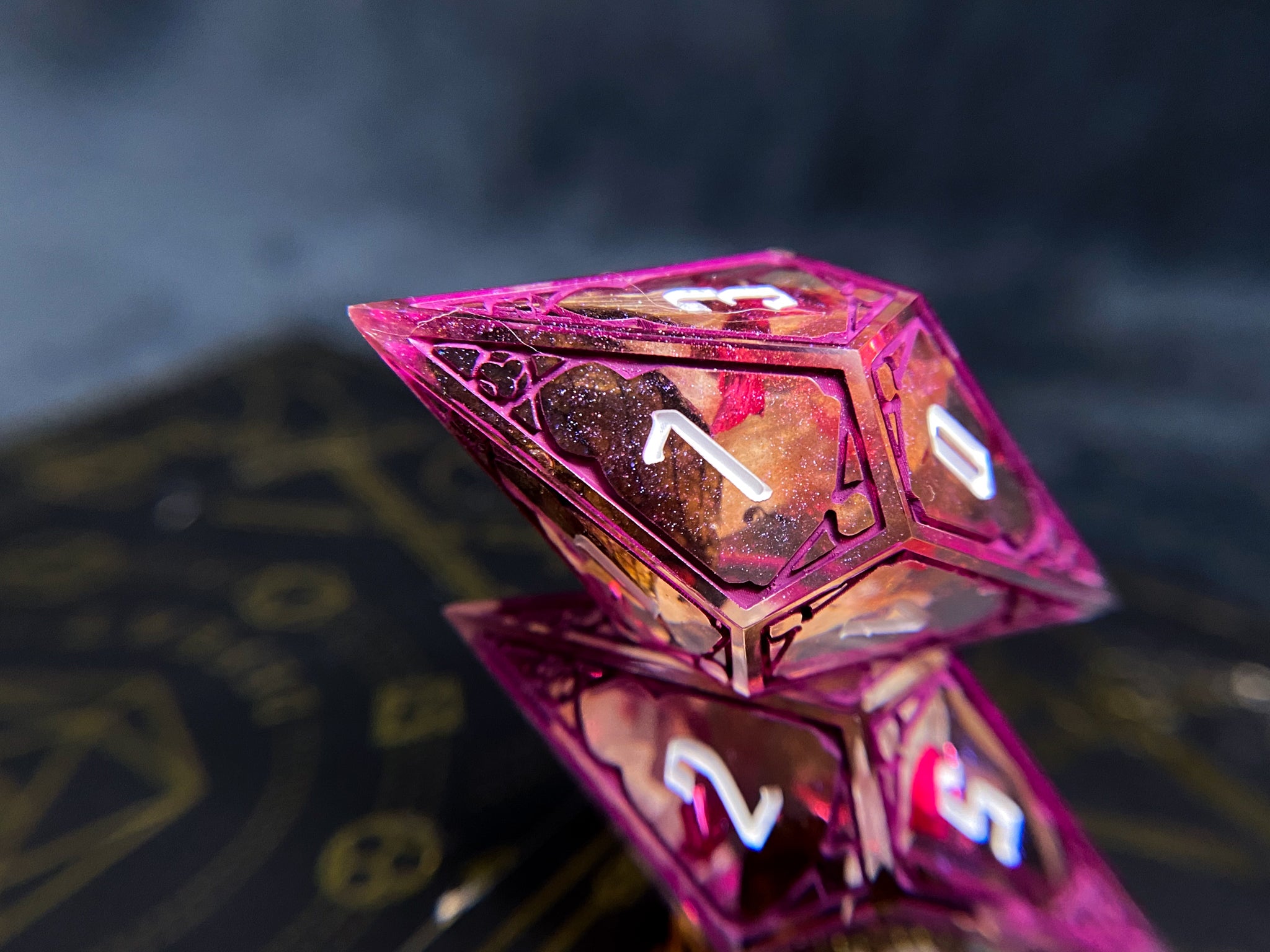 Pair of oversized d10s, flower petals in shades of deep red-black and white with flakes of pink and warm pink/purple colorshift. Frames inked in dark pink and numbers in white.