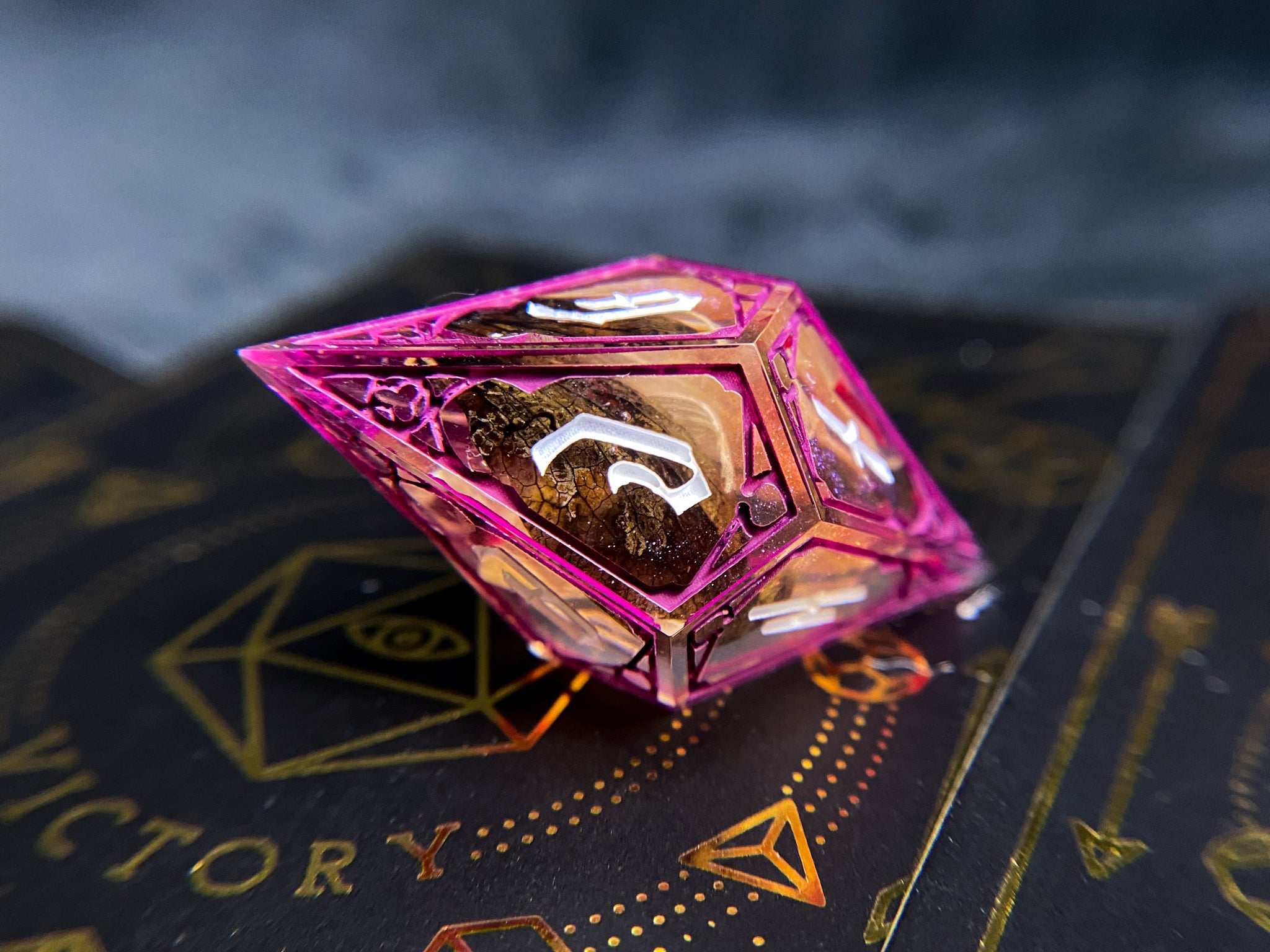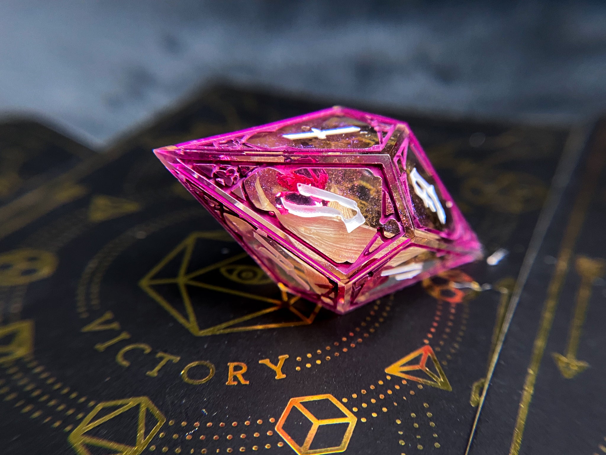 Single oversized d10 with a novelty Infernal font, flower petals in shades of deep red-black and white with flakes of pink and warm pink/purple colorshift. Frames inked in dark pink and numbers in white.