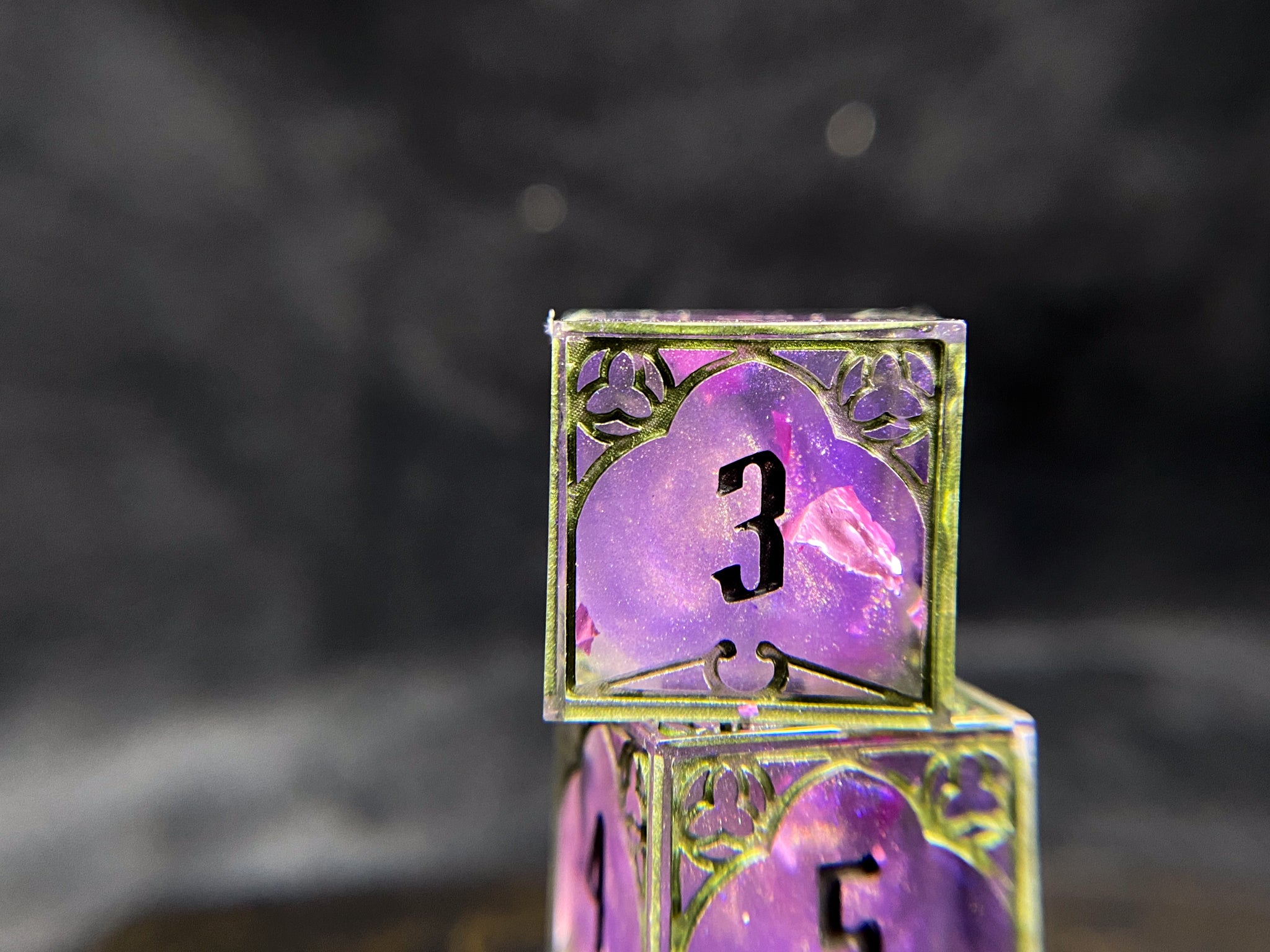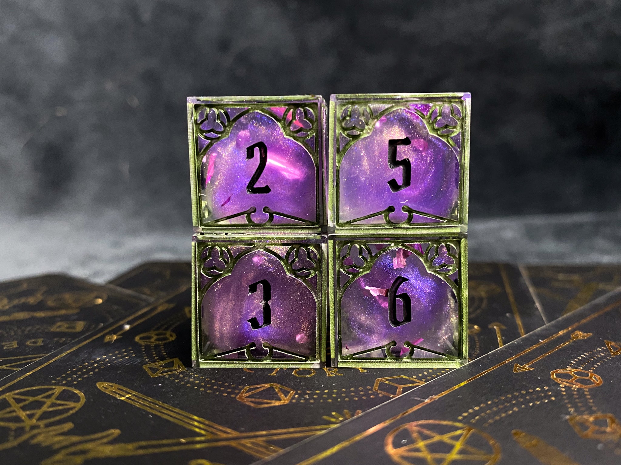 Four oversized d6s, shimmering clouds of dark purple and bronze-lavender, with flakes of purple foil. Frames inked in metallic green and numbers in black.