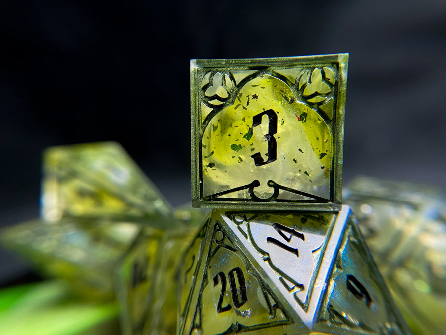 Set of 7 handmade dice, acidic green waves with flakes of silver foil and soft blue shimmer. Frames inked in metallic green and numbers in black.