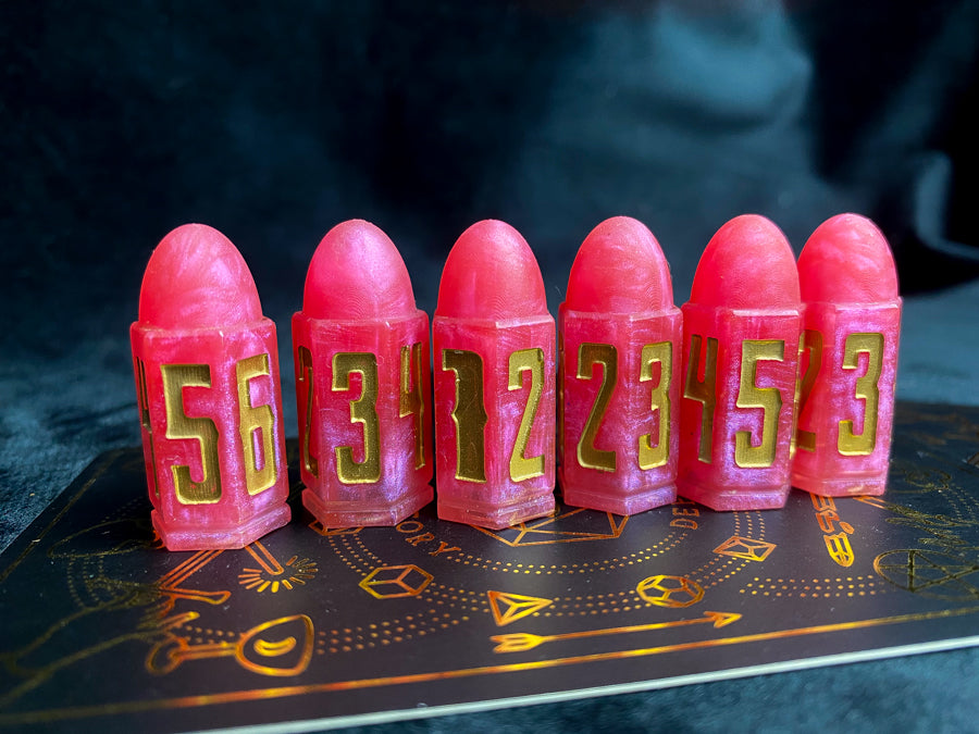 Set of 6 handmade dice, bullet-style d6s in candy-pink. Numbers inked in chrome gold.