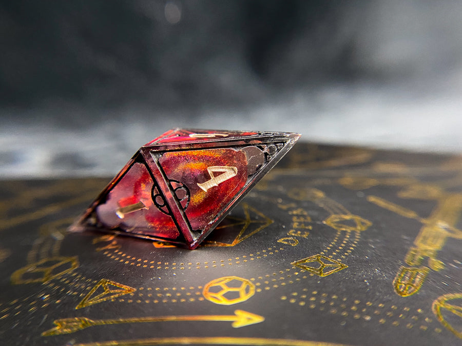 Single oversized d8, clear resin with waves of deep red-gold. Frames inked in black and numbers in champagne.