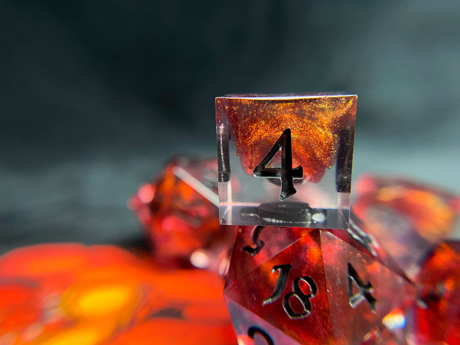 Set of 8 handmade dice, clear resin with waves of deep red-gold. Inked in black.