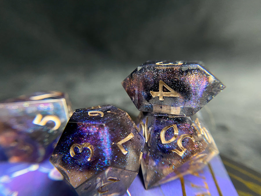 Set of 8 handmade dice, starry clouds of blue-purple-gold colorshift with starry white sparkle. Inked in champagne.